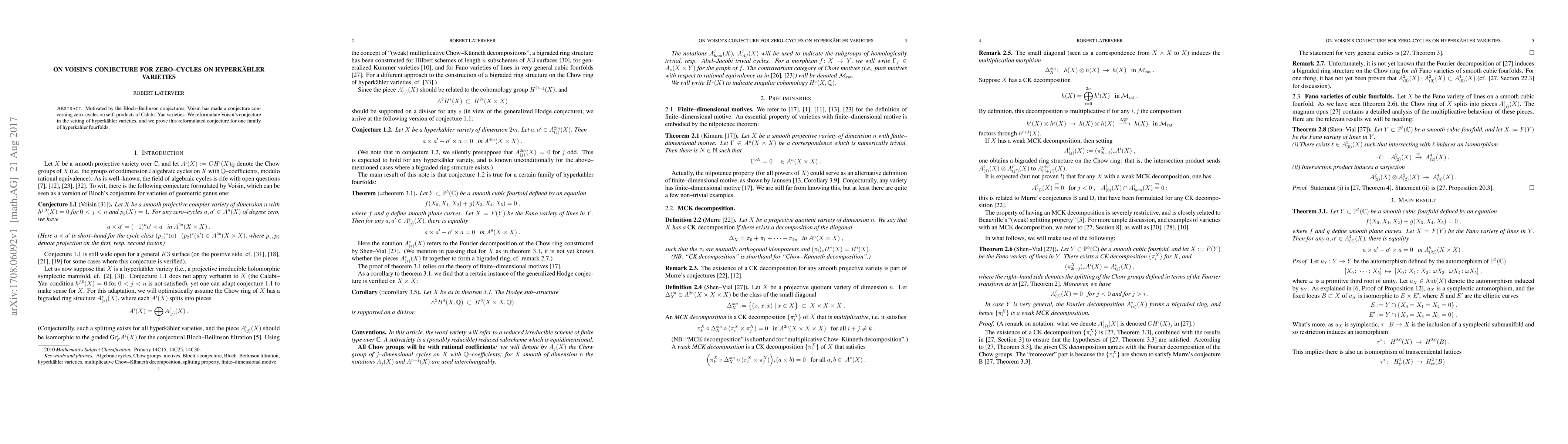 This paper reformulates Voisin's conjecture on zero-cycles on Calabi-Yau varieties within the context of hyperkähler varieties and proves the reformulated conjecture for a specific family of hyperkähler fourfolds. The reformulation and proof are motivated by the Bloch-Beilinson conjectures.