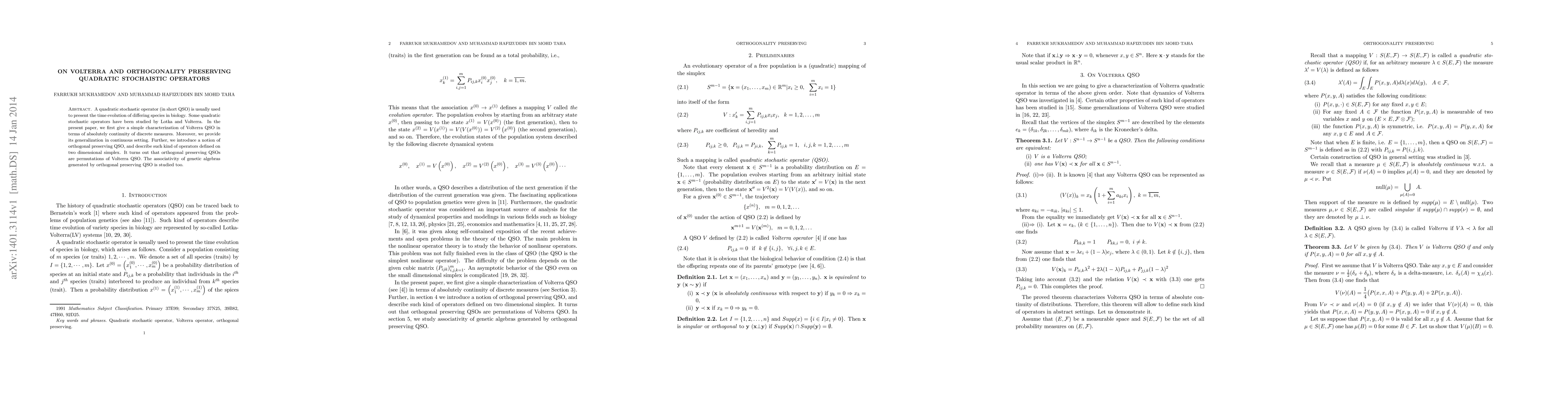 A quadratic stochastic operator (in short QSO) is usually used to present the time evolution of differing species in biology. Some quadratic stochastic operators have been studied by Lotka and Volterra. In the present paper, we first give a simple characterization of Volterra QSO in terms of absolutely continuity of discrete measures. Moreover, we provide its generalization in continuous setting. Further, we introduce a notion of orthogonal preserving QSO, and describe such kind of operators defined on two dimensional simplex. It turns out that orthogonal preserving QSOs are permutations of Volterra QSO. The associativity of genetic algebras generated by orthogonal preserving QSO is studied too.