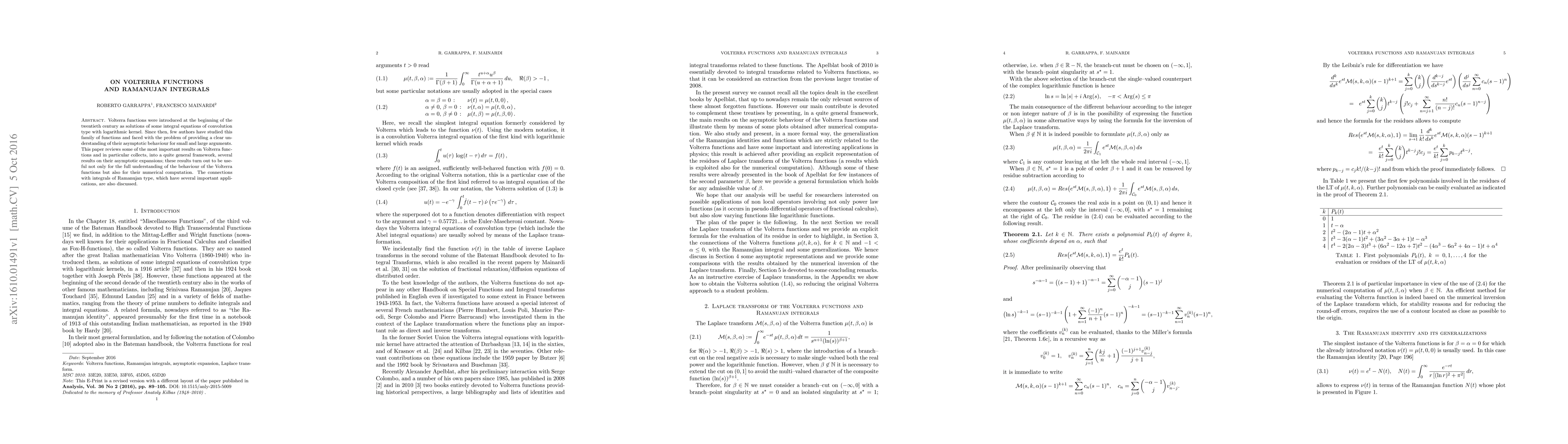 This paper reviews significant results on Volterra functions, focusing on their asymptotic expansions and numerical computation, and explores their connections with Ramanujan integrals, highlighting their practical applications.
