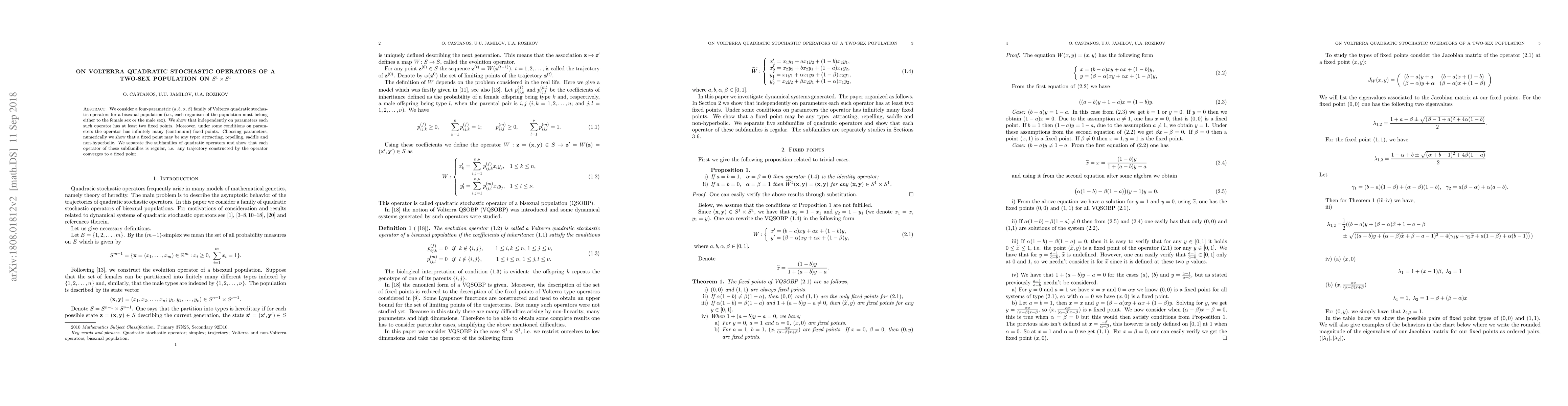 We consider a four-parametric $(a, b, \alpha, \beta)$ family of Volterra quadratic stochastic operators for a bisexual population (i.e., each organism of the population must belong either to the female sex or the male sex). We show that independently on parameters each such operator has at least two fixed points. Moreover, under some conditions on parameters the operator has infinitely many (continuum) fixed points. Choosing parameters, numerically we show that a fixed point may be any type: attracting, repelling, saddle and non-hyperbolic. We separate five subfamilies of quadratic operators and show that each operator of these subfamilies is regular, i.e. any trajectory constructed by the operator converges to a fixed point.