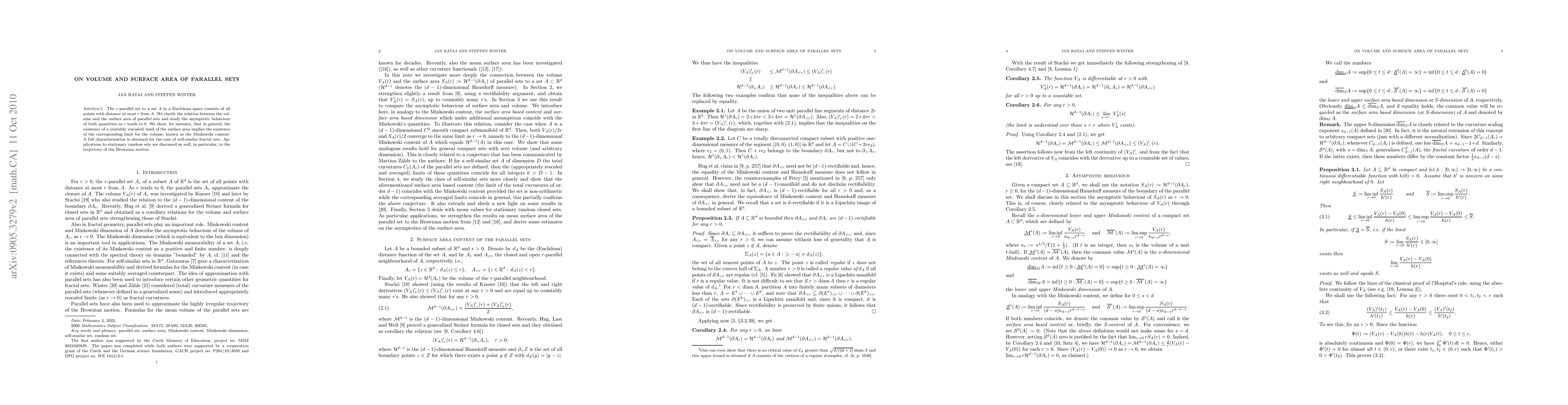 This paper investigates the relationship between the volume and surface area of r-parallel sets in Euclidean space, demonstrating that the limit behavior of surface area implies the existence of the volume limit, known as the Minkowski content. It provides a complete characterization for self-similar fractal sets and explores applications to stationary random sets, including the trajectory of Brownian motion.