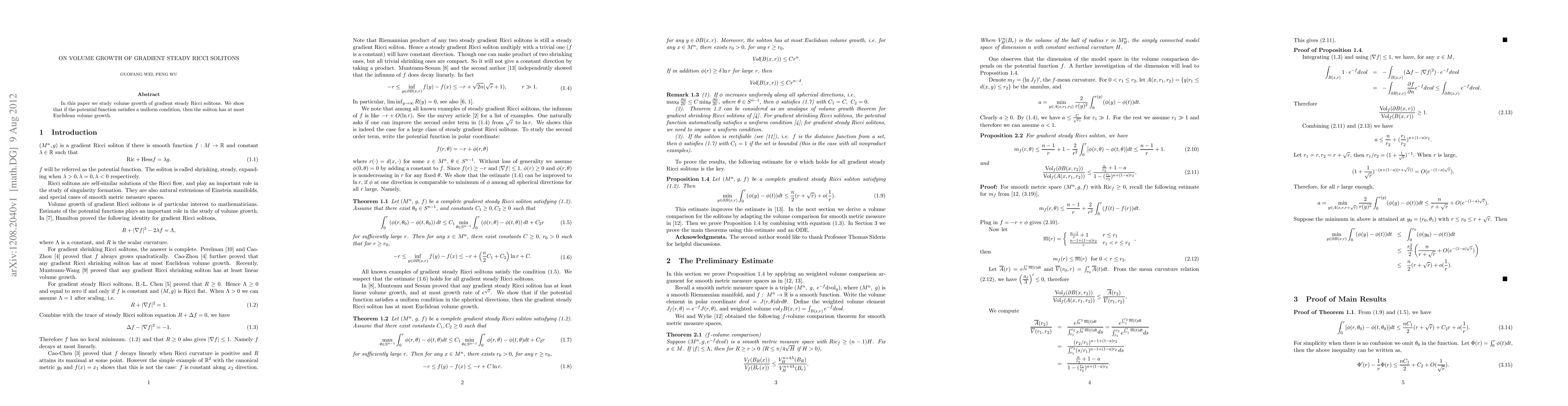Summary: The research demonstrates that gradient steady Ricci solitons exhibit at most Euclidean volume growth when the potential function adheres to a specified uniform condition. This provides insight into the volume behavior of these geometric structures.