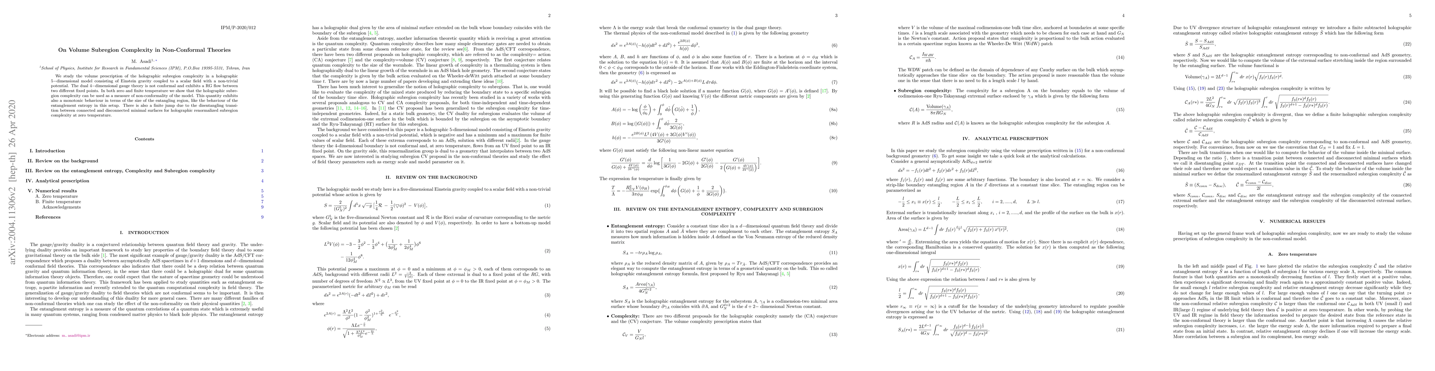 This paper investigates the volume prescription for holographic subregion complexity in a 5D model of Einstein gravity coupled to a non-trivial scalar field, finding it correlates with the non-conformality of the dual 4D gauge theory. The study reveals a monotonic behavior with entangling region size and a finite jump during the disentangling transition at zero temperature.