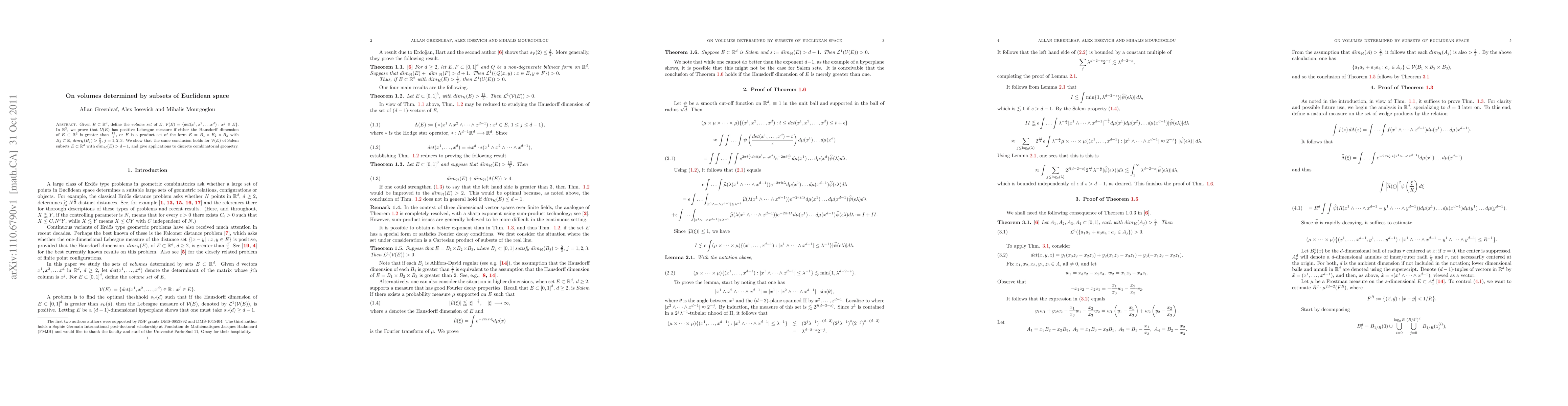Given $E \subset {\Bbb R}^d$, define the \emph{volume set} of $E$, ${\mathcal V}(E)= \{det(x^1, x^2, ... x^d): x^j \in E\}$. In $\R^3$, we prove that ${\mathcal V}(E)$ has positive Lebesgue measure if either the Hausdorff dimension of $E\subset \Bbb R^3$ is greater than 13/5, or $E$ is a product set of the form $E=B_1\times B_2\times B_3$ with $B_j\subset\R,\, dim_{\mathcal H}(B_j)>2/3,\, j=1,2,3$. We show that the same conclusion holds for $\V(E)$ of Salem subsets $E\subset\R^d$ with $\hde>d-1$, and give applications to discrete combinatorial geometry.