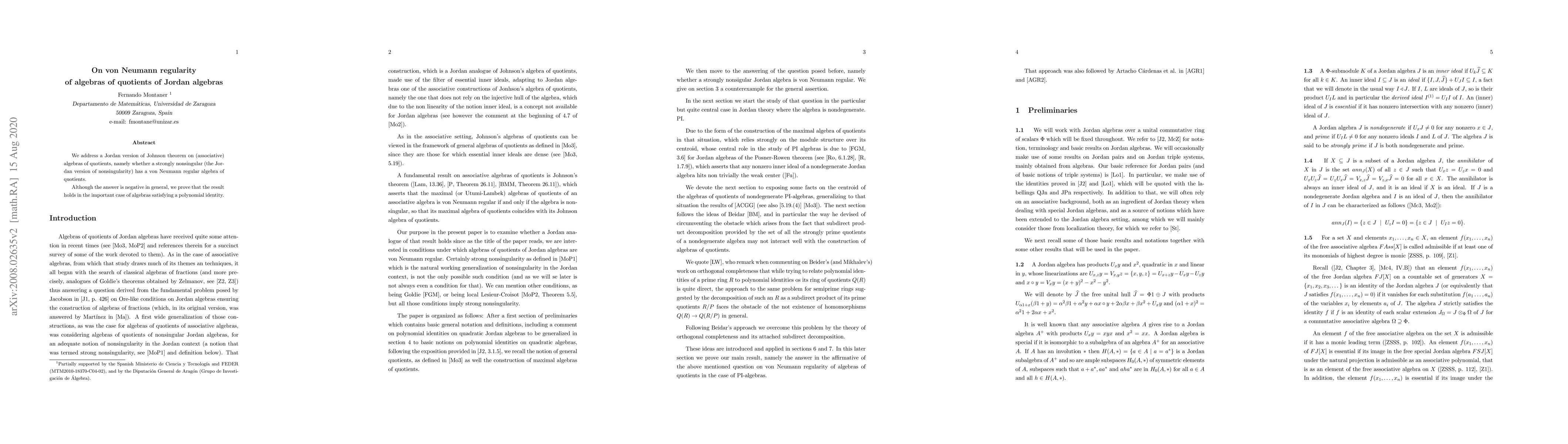 This paper investigates whether strongly nonsingular Jordan algebras yield von Neumann regular algebras of quotients, akin to Johnson's theorem for associative algebras. The general answer is negative, but the authors prove the positive result for algebras satisfying a polynomial identity.