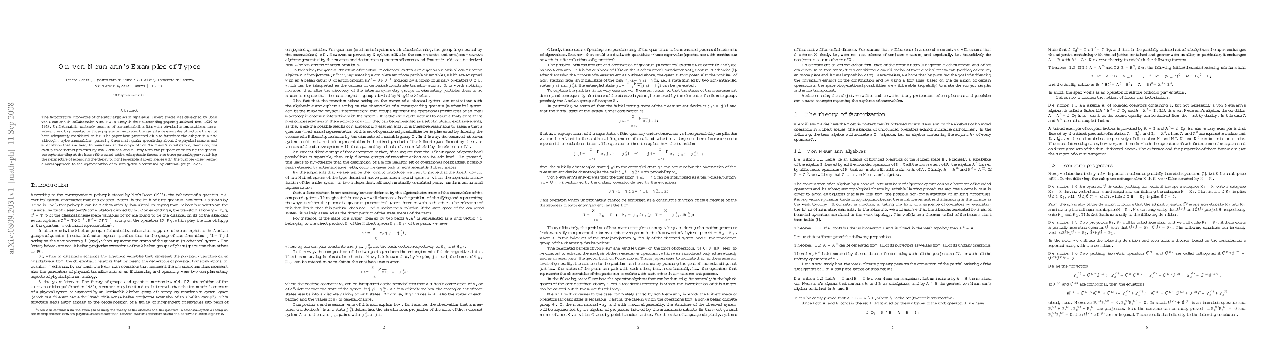 The paper introduces in a new although maybe unusual form the examples of types provided by J. von Neumann and F.J. Murray in their outstanding papers on algebraic factorization (1936-1943)pursuing three main aims: speculating about the physical reasons and motivations that are likely to have been at the origin of von Neumann's investigation; describing the examples of factors provided by those authors with the purpose of clarifying the general concepts standing at the base of the classification of factors into three general types; outlining the perspective of extending the theory to non--separable Hilbert spaces with the purpose of suggesting a novel approach to the representation of infinite systems controlled by external gauge fields.