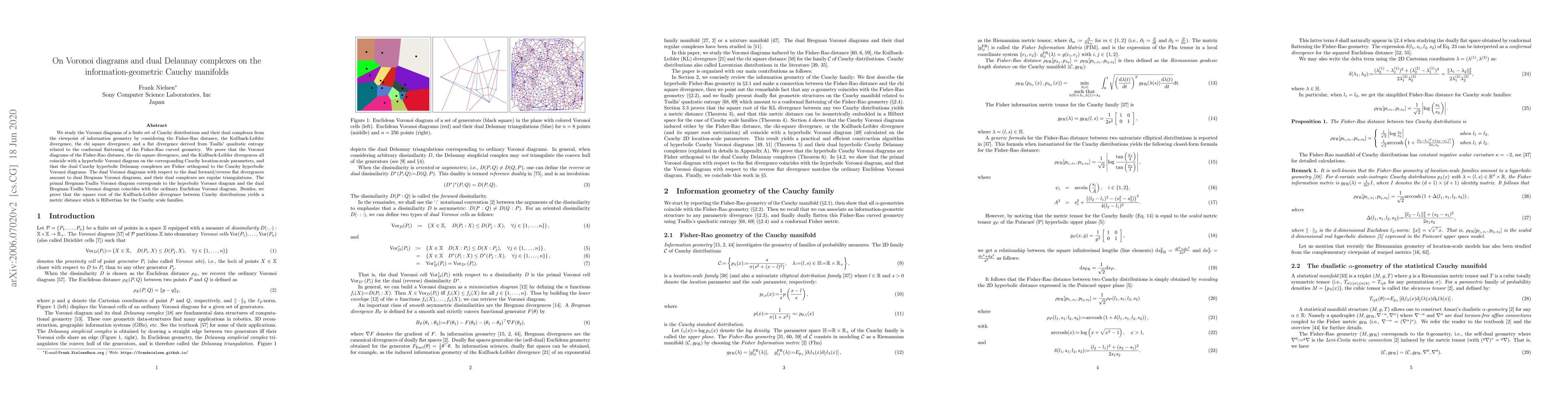 We study the Voronoi diagrams of a finite set of Cauchy distributions and their dual complexes from the viewpoint of information geometry by considering the Fisher-Rao distance, the Kullback-Leibler divergence, the chi square divergence, and a flat divergence derived from Tsallis' quadratic entropy related to the conformal flattening of the Fisher-Rao curved geometry. We prove that the Voronoi diagrams of the Fisher-Rao distance, the chi square divergence, and the Kullback-Leibler divergences all coincide with a hyperbolic Voronoi diagram on the corresponding Cauchy location-scale parameters, and that the dual Cauchy hyperbolic Delaunay complexes are Fisher orthogonal to the Cauchy hyperbolic Voronoi diagrams. The dual Voronoi diagrams with respect to the dual forward/reverse flat divergences amount to dual Bregman Voronoi diagrams, and their dual complexes are regular triangulations. The primal Bregman-Tsallis Voronoi diagram corresponds to the hyperbolic Voronoi diagram and the dual Bregman-Tsallis Voronoi diagram coincides with the ordinary Euclidean Voronoi diagram. Besides, we prove that the square root of the Kullback-Leibler divergence between Cauchy distributions yields a metric distance which is Hilbertian for the Cauchy scale families.