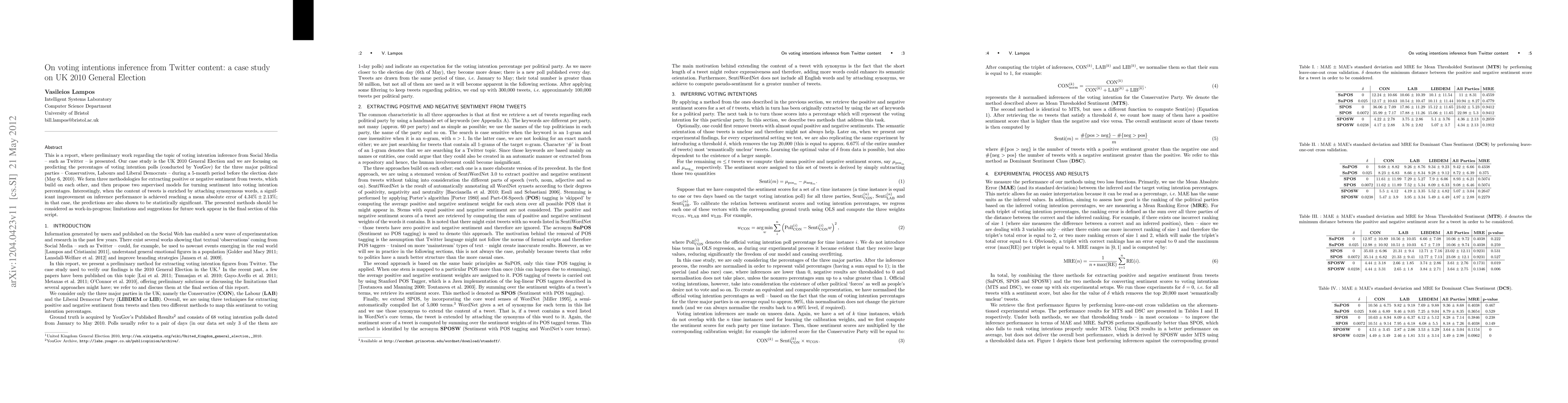 This is a report, where preliminary work regarding the topic of voting intention inference from Social Media - such as Twitter - is presented. Our case study is the UK 2010 General Election and we are focusing on predicting the percentages of voting intention polls (conducted by YouGov) for the three major political parties - Conservatives, Labours and Liberal Democrats - during a 5-month period before the election date (May 6, 2010). We form three methodologies for extracting positive or negative sentiment from tweets, which build on each other, and then propose two supervised models for turning sentiment into voting intention percentages. Interestingly, when the content of tweets is enriched by attaching synonymous words, a significant improvement on inference performance is achieved reaching a mean absolute error of 4.34% +/- 2.13%; in that case, the predictions are also shown to be statistically significant. The presented methods should be considered as work-in-progress; limitations and suggestions for future work appear in the final section of this script.