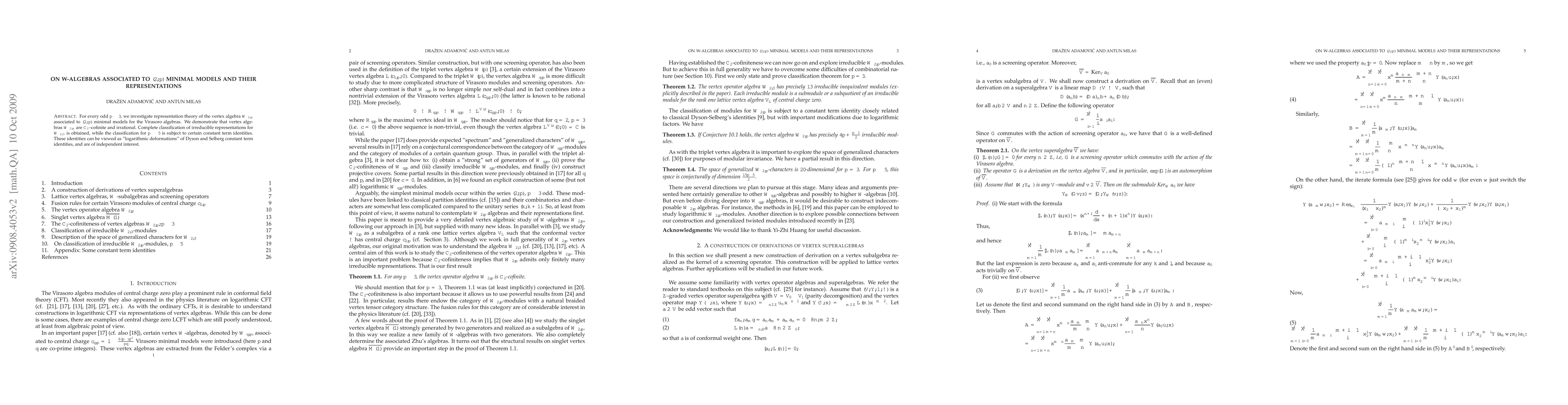 For every odd p \geq 3, we investigate representation theory of the vertex algebra WW_{2,p} associated to (2,p) minimal models for the Virasoro algebras. We demonstrate that vertex algebras WW_{2,p} are C_2--cofinite and irrational. Complete classification of irreducible representations for WW_{2,3} is obtained, while the classification for p \geq 5 is subject to certain constant term identities. These identities can be viewed as "logarithmic deformations" of Dyson and Selberg constant term identities, and are of independent interest.