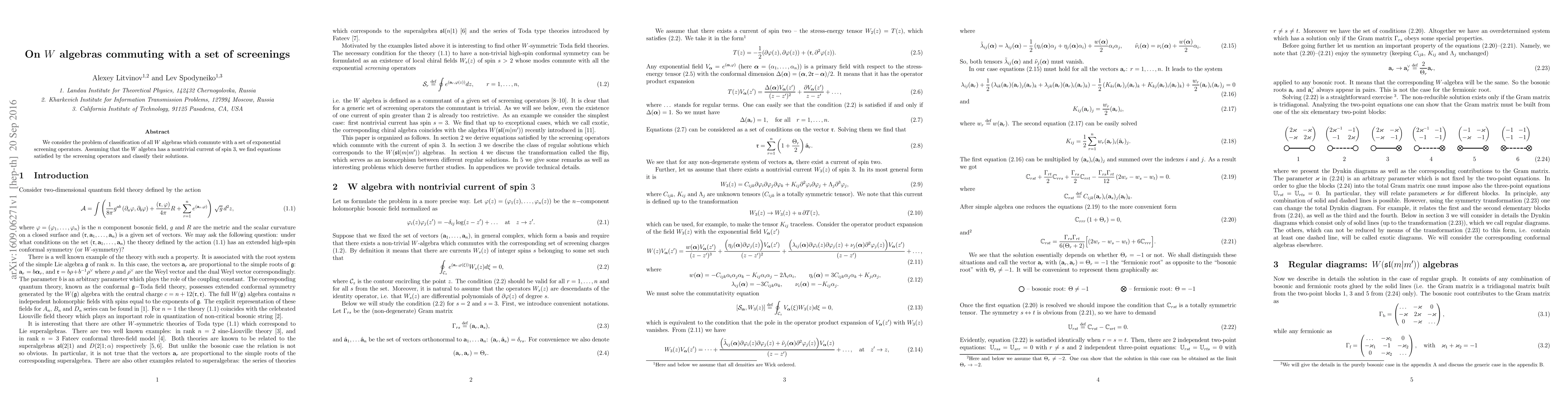 This paper classifies W algebras that commute with a set of exponential screening operators, assuming the presence of a nontrivial current of spin 3, and derives equations to determine the solutions for these screening operators.