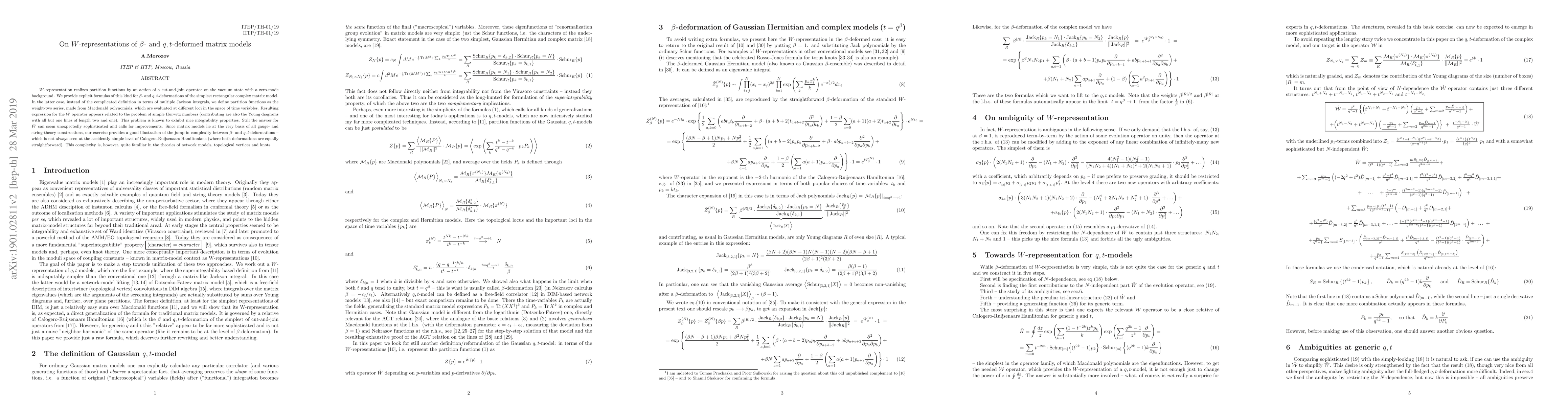 $W$-representation realizes partition functions by an action of a cut-and-join-like operator on the vacuum state with a zero-mode background. We provide explicit formulas of this kind for $\beta$- and $q,t$-deformations of the simplest rectangular complex matrix model. In the latter case, instead of the complicated definition in terms of multiple Jackson integrals, we define partition functions as the weight-two series, made from Macdonald polynomials, which are evaluated at different loci in the space of time variables. Resulting expression for the $\hat W$ operator appears related to the problem of simple Hurwitz numbers (contributing are also the Young diagrams with all but one lines of length two and one). This problem is known to exhibit nice integrability properties. Still the answer for $\hat W$ can seem unexpectedly sophisticated and calls for improvements. Since matrix models lie at the very basis of all gauge- and string-theory constructions, our exercise provides a good illustration of the jump in complexity between $\beta$- and $q,t$-deformations -- which is not always seen at the accidently simple level of Calogero-Ruijsenaars Hamiltonians (where both deformations are equally straightforward). This complexity is, however, quite familiar in the theories of network models, topological vertices and knots.