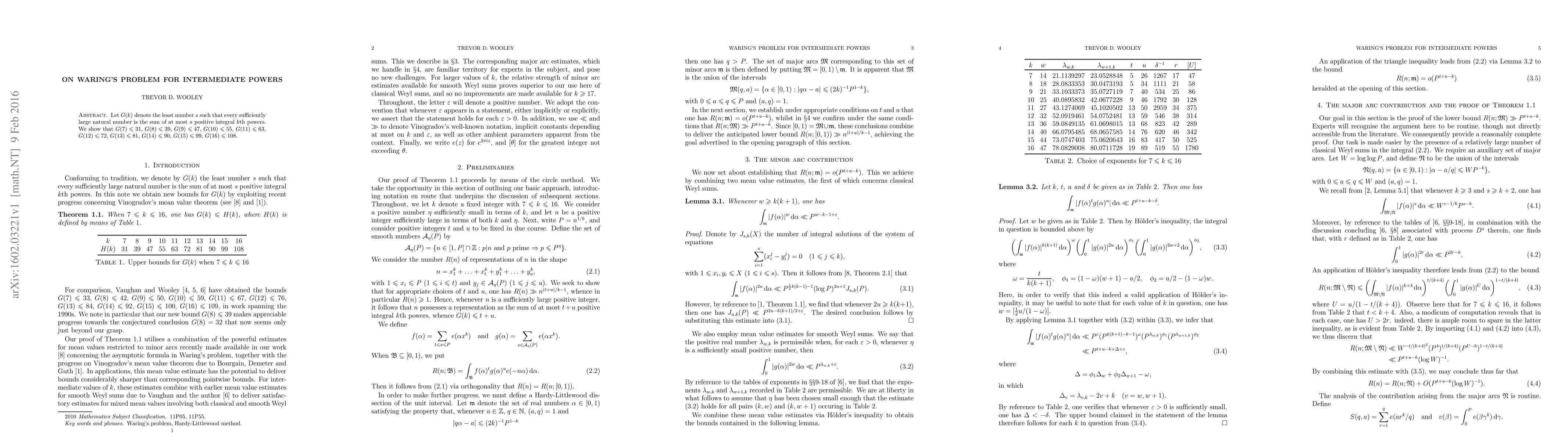 Let $G(k)$ denote the least number $s$ such that every sufficiently large natural number is the sum of at most $s$ positive integral $k$th powers. We show that $G(7)\le 31$, $G(8)\le 39$, $G(9)\le 47$, $G(10)\le 55$, $G(11)\le 63$, $G(12)\le 72$, $G(13)\le 81$, $G(14)\le 90$, $G(15)\le 99$, $G(16)\le 108$.