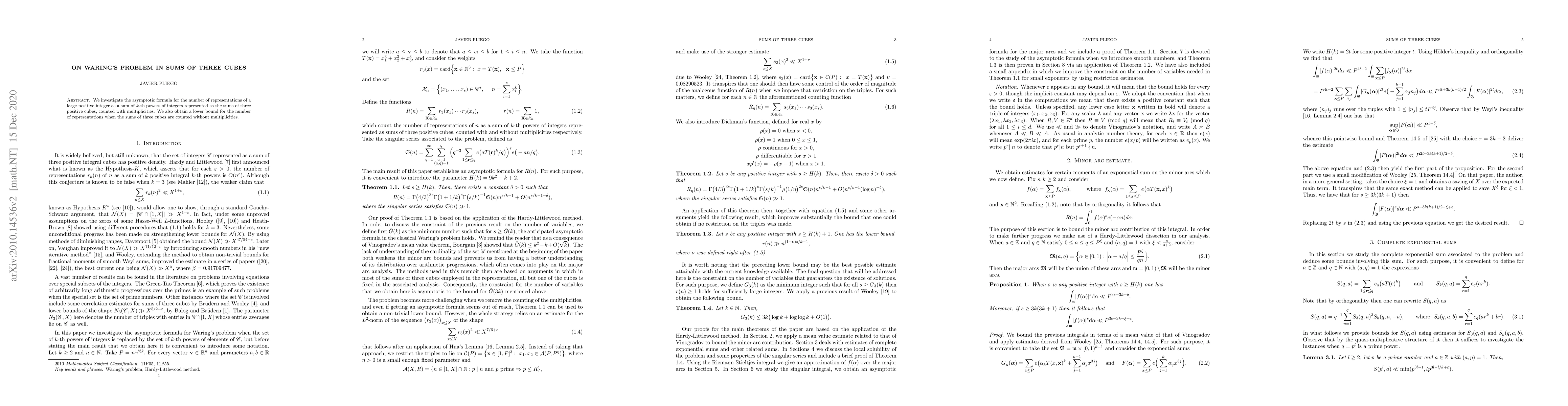 Summary: This paper studies the asymptotic formula for representing large integers as sums of three positive cubes, including multiplicity counts, and provides a lower bound for the representation count without multiplicity.