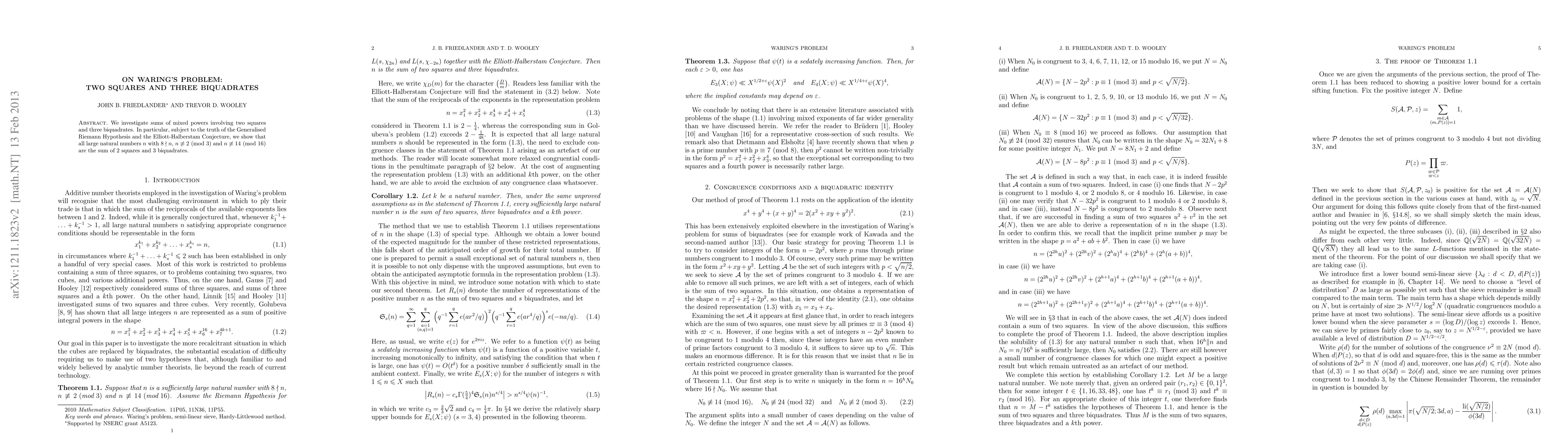 Summary: This paper demonstrates that, under certain conjectures, large natural numbers not meeting specific modular conditions can be expressed as the sum of two squares and three biquadrates (fourth powers). This addresses a variant of Waring's problem involving mixed powers.