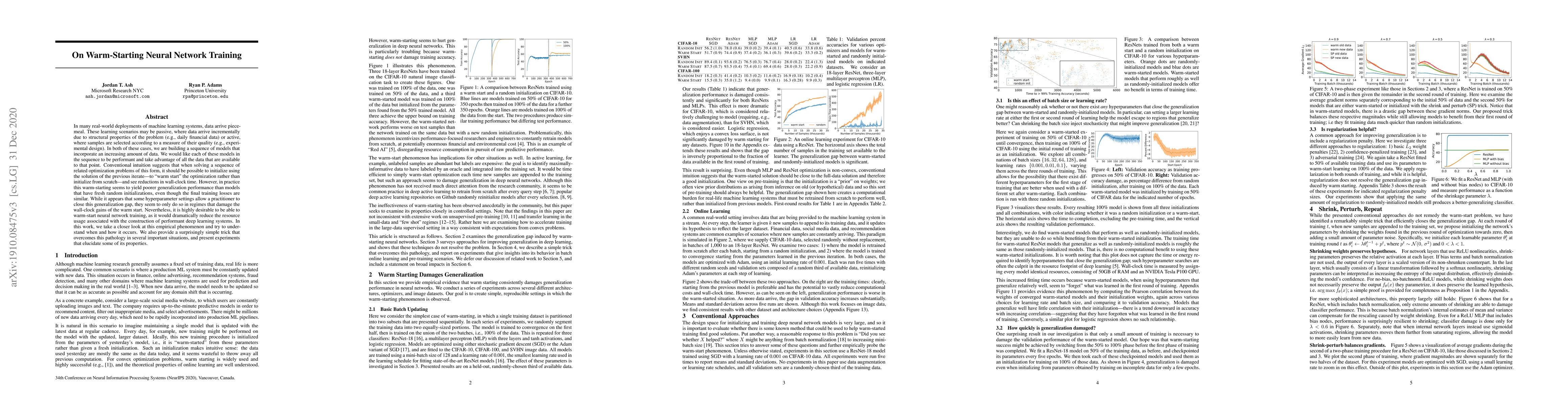 Researchers investigate how warm-starting neural network training affects performance and find that it can lead to poorer generalization but offer a simple solution to overcome this issue.