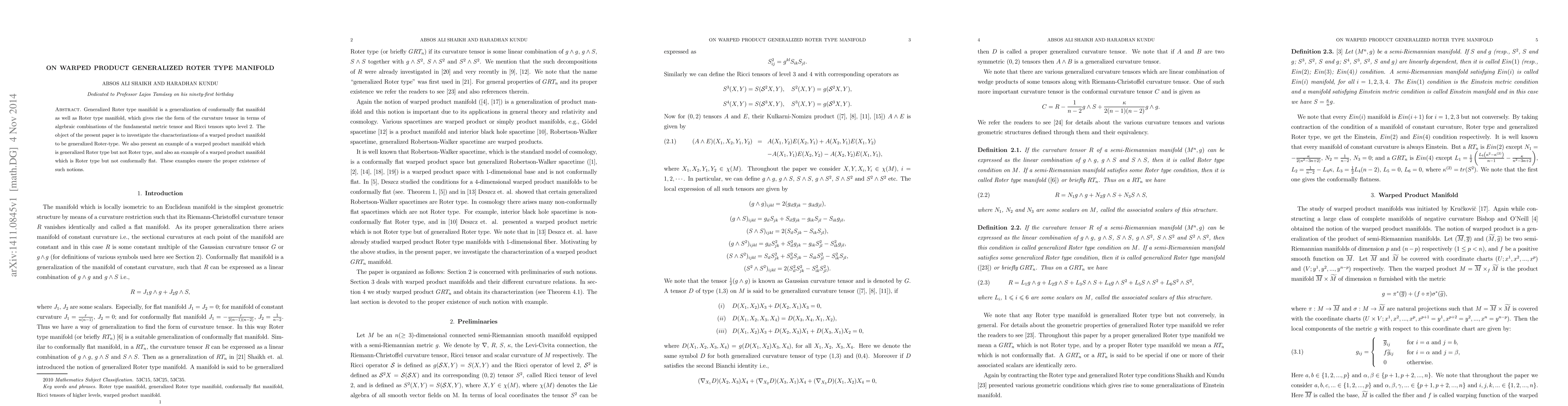 This paper explores the characterization of warped product manifolds that are generalized Roter type, distinguishing them from Roter type and conformally flat manifolds. It provides examples illustrating the nuanced differences between these types of manifolds.