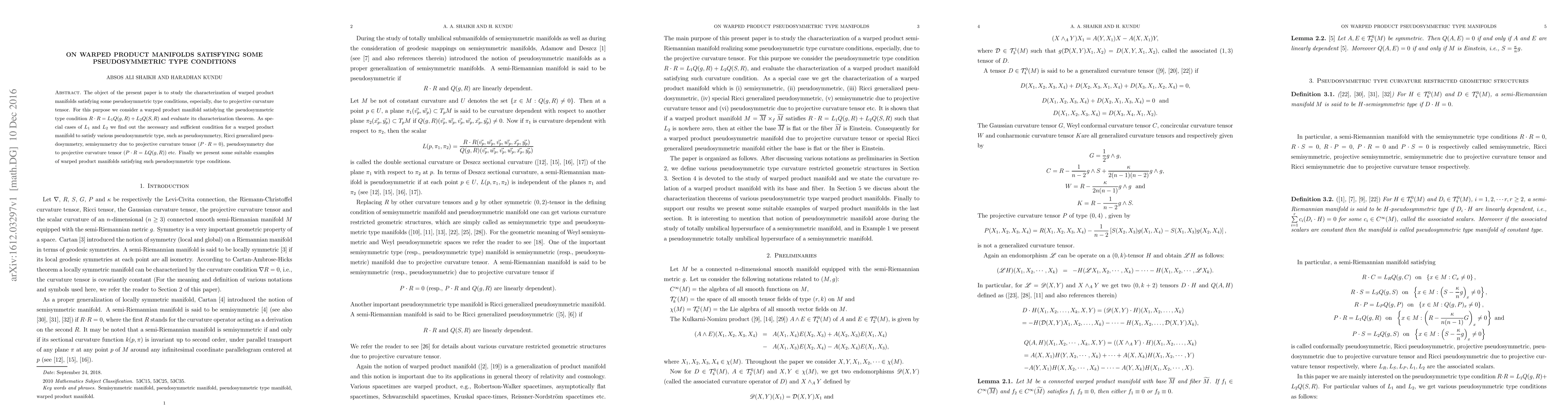 The object of the present paper is to study the characterization of warped product manifolds satisfying some pseudosymmetric type conditions, especially, due to projective curvature tensor. For this purpose we consider a warped product manifold satisfying the pseudosymmetric type condition $R\cdot R = L_1 Q(g,R) + L_2 Q(S,R)$ and evaluate its characterization theorem. As special cases of $L_1$ and $L_2$ we find out the necessary and sufficient condition for a warped product manifold to satisfy various pseudosymmetric type, such as pseudosymmetry, Ricci generalized pseudosymmetry, semisymmetry due to projective curvature tensor ($P\cdot R = 0$), pseudosymmetry due to projective curvature tensor ($P\cdot R = L Q(g,R)$) etc. Finally we present some suitable examples of warped product manifolds satisfying such pseudosymmetric type conditions.