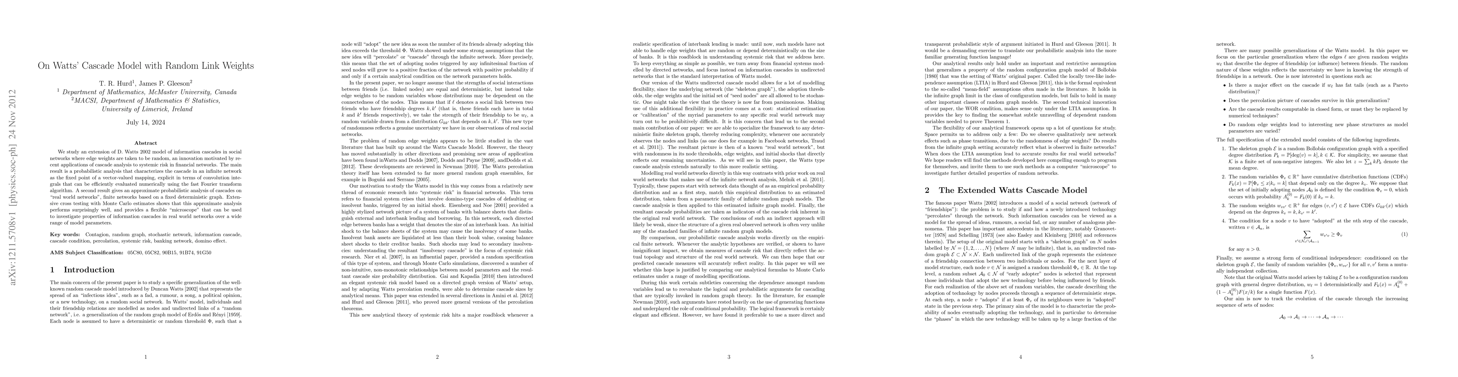 We study an extension of Duncan Watts' 2002 model of information cascades in social networks where edge weights are taken to be random, an innovation motivated by recent applications of cascade analysis to systemic risk in financial networks. The main result is a probabilistic analysis that characterizes the cascade in an infinite network as the fixed point of a vector-valued mapping, explicit in terms of convolution integrals that can be efficiently evaluated numerically using the fast Fourier transform algorithm. A second result gives an approximate probabilistic analysis of cascades on "real world networks", finite networks based on a fixed deterministic graph. Extensive cross testing with Monte Carlo estimates shows that this approximate analysis performs surprisingly well, and provides a flexible microscope that can be used to investigate properties of information cascades in real world networks over a wide range of model parameters.