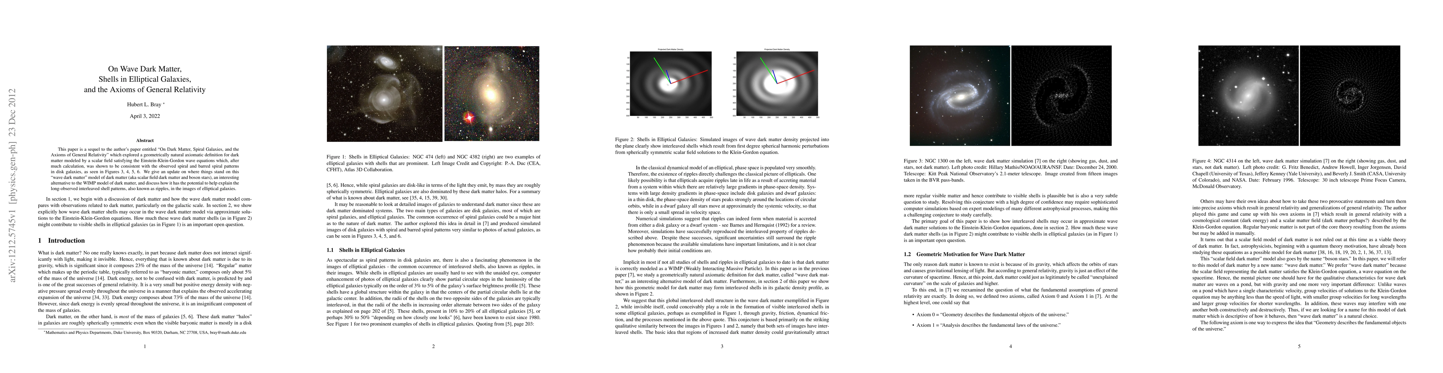 This paper is a sequel to the author's paper entitled "On Dark Matter, Spiral Galaxies, and the Axioms of General Relativity" [arXiv:1004.4016] which explored a geometrically natural axiomatic definition for dark matter modeled by a scalar field satisfying the Einstein-Klein-Gordon wave equations which, after much calculation, was shown to be consistent with the observed spiral and barred spiral patterns in disk galaxies. We give an update on where things stand on this "wave dark matter" model of dark matter (aka scalar field dark matter and boson stars), an interesting alternative to the WIMP model of dark matter, and discuss how it has the potential to help explain the long-observed interleaved shell patterns, also known as ripples, in the images of elliptical galaxies.