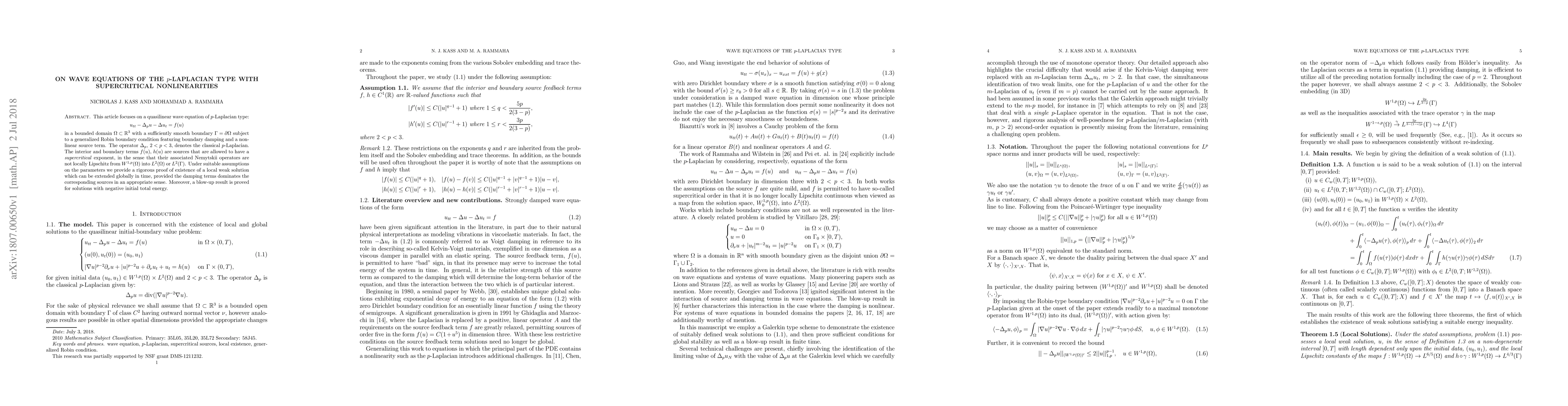 This article focuses on a quasilinear wave equation of $p$-Laplacian type: \[ u_{tt} - \Delta_p u -\Delta u_t = f(u) \] in a bounded domain $\Omega \subset \mathbb{R}^3$ with a sufficiently smooth boundary $\Gamma=\partial \Omega$ subject to a generalized Robin boundary condition featuring boundary damping and a nonlinear source term. The operator $\Delta_p$, $2