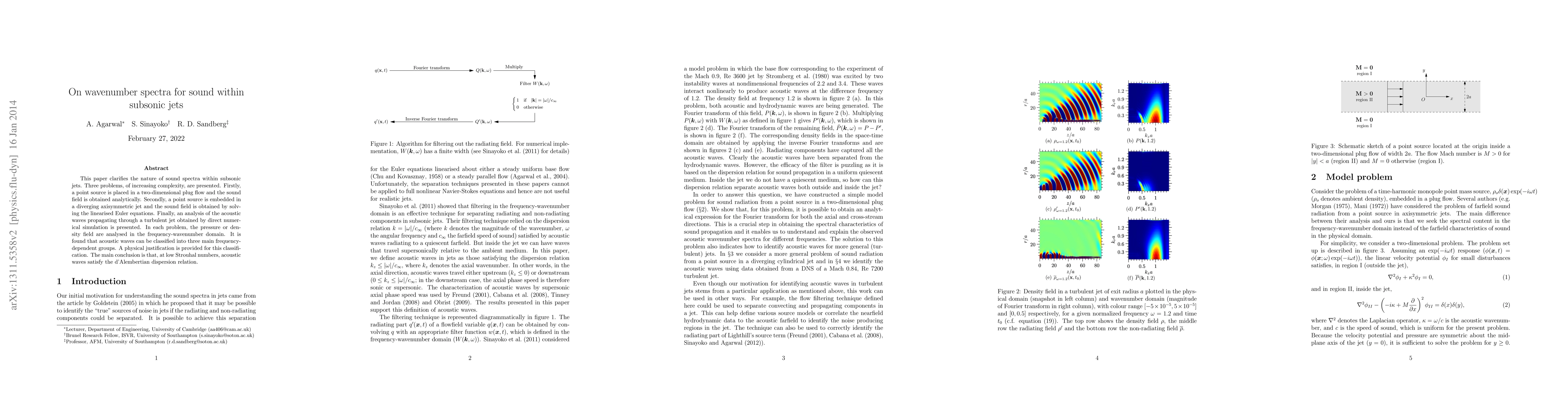 This paper clarifies the nature of sound spectra within subsonic jets. Three problems, of increasing complexity, are presented. Firstly, a point source is placed in a two-dimensional plug flow and the sound field is obtained analytically. Secondly, a point source is embedded in a diverging axisymmetric jet and the sound field is obtained by solving the linearised Euler equations. Finally, an analysis of the acoustic waves propagating through a turbulent jet obtained by direct numerical simulation is presented. In each problem, the pressure or density field are analysed in the frequency-wavenumber domain. It is found that acoustic waves can be classified into three main frequency-dependent groups. A physical justification is provided for this classification. The main conclusion is that, at low Strouhal numbers, acoustic waves satisfy the d'Alembertian dispersion relation.