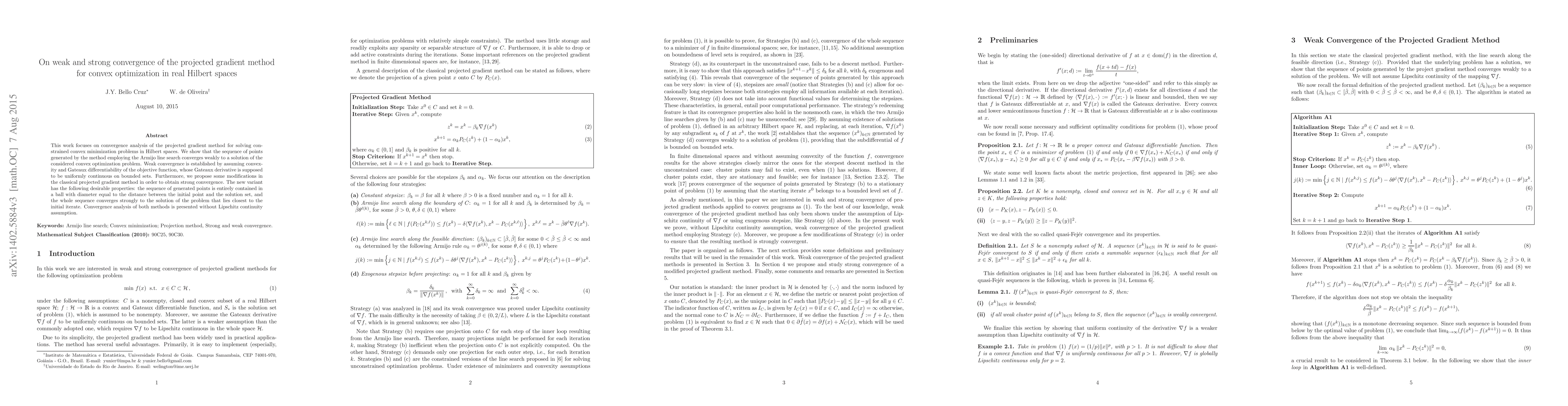This paper analyzes the projected gradient method for solving constrained convex optimization in Hilbert spaces, proving weak convergence under convexity and uniform continuity of the Gateaux derivative. It also introduces modifications to achieve strong convergence, ensuring the sequence remains within a bounded radius and converges strongly to the nearest solution.