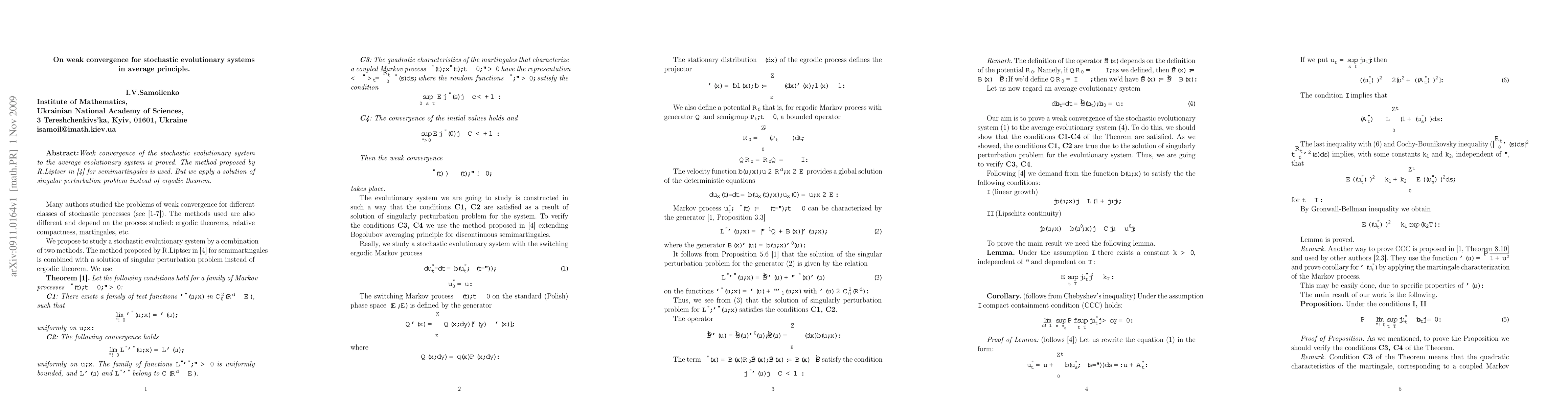 Weak convergence of the stochastic evolutionary system to the average evolutionary system is proved. The method proposed by R.Liptser in for semimartingales is used. But we apply a solution of singular perturbation problem instead of ergodic theorem.