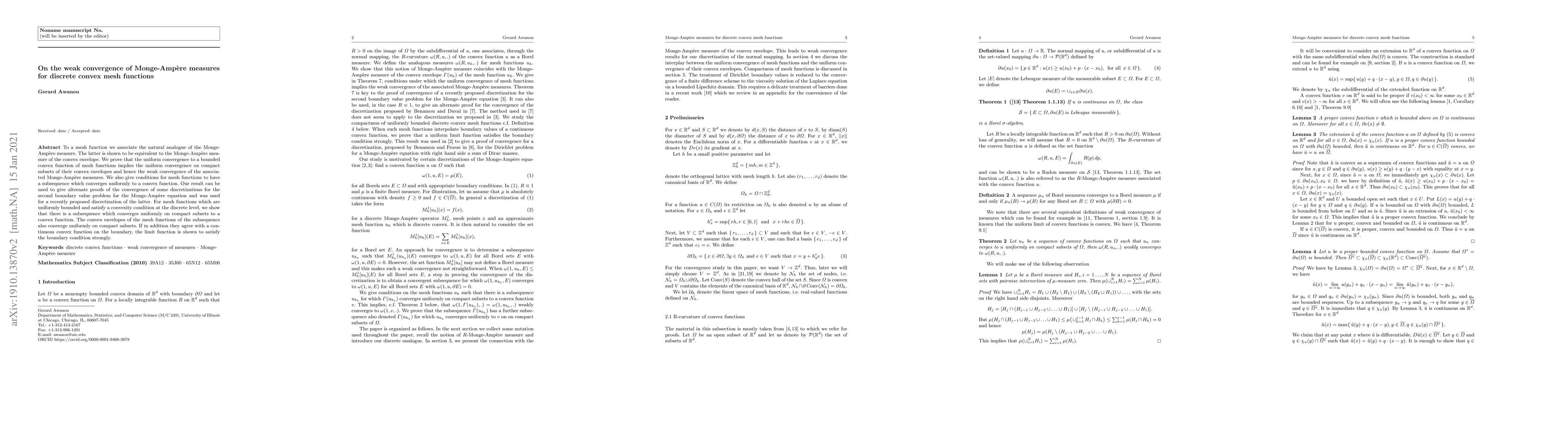 To a mesh function we associate the natural analogue of the Monge-Ampere measure. The latter is shown to be equivalent to the Monge-Ampere measure of the convex envelope. We prove that the uniform convergence to a bounded convex function of mesh functions implies the uniform convergence on compact subsets of their convex envelopes and hence the weak convergence of the associated Monge-Ampere measures. We also give conditions for mesh functions to have a subsequence which converges uniformly to a convex function. Our result can be used to give alternate proofs of the convergence of some discretizations for the second boundary value problem for the Monge-Ampere equation and was used for a recently proposed discretization of the latter. For mesh functions which are uniformly bounded and satisfy a convexity condition at the discrete level, we show that there is a subsequence which converges uniformly on compact subsets to a convex function. The convex envelopes of the mesh functions of the subsequence also converge uniformly on compact subsets. If in addition they agree with a continuous convex function on the boundary, the limit function is shown to satisfy the boundary condition strongly.