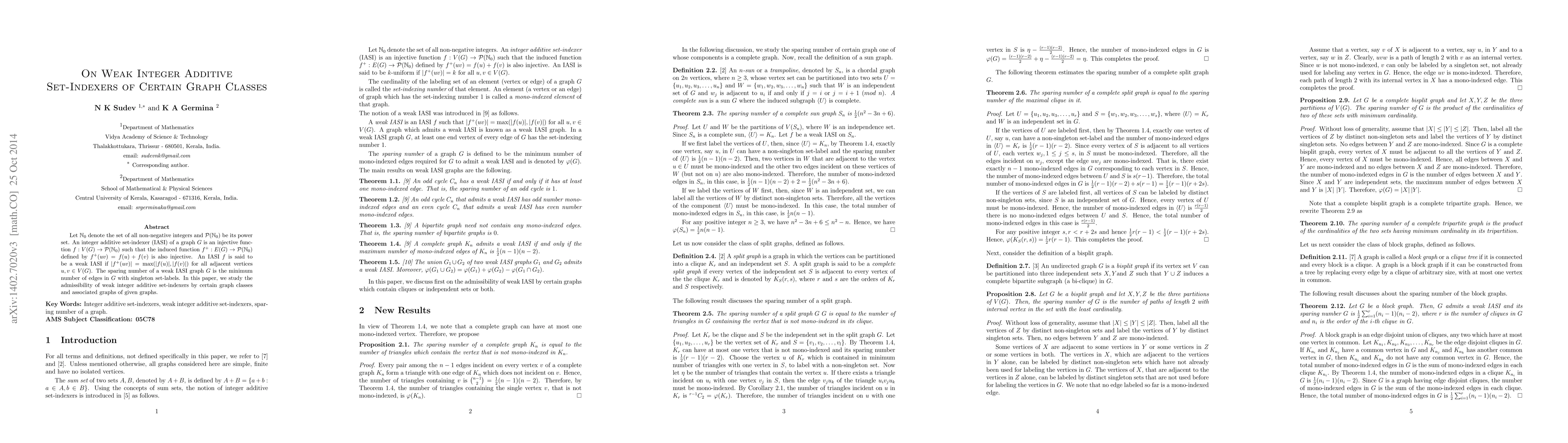 An integer additive set-indexer is defined as an injective function $f:V(G)\rightarrow 2^{\mathbb{N}_0}$ such that the induced function $g_f:E(G) \rightarrow 2^{\mathbb{N}_0}$ defined by $g_f (uv) = f(u)+ f(v)$ is also injective. An integer additive set-indexer is said to be $k$-uniform if $|g_f(uv)|=k$ for all $u,v\in V(G)$. An integer additive set-indexer $f$ is said to be a weak IASI if $|g_f(uv)|=max(|f(u)|,|f(v)|)$ for all $u,v\in V(G)$. The sparing number of a graph $G$ is the minimum number of edges in $G$ with singleton set-labels, so that $G$ admits a weak integer additive set-indexer. In this paper, we study the admissibility of weak integer additive set-indexers by certain graph classes and certain associated graphs of given graphs.