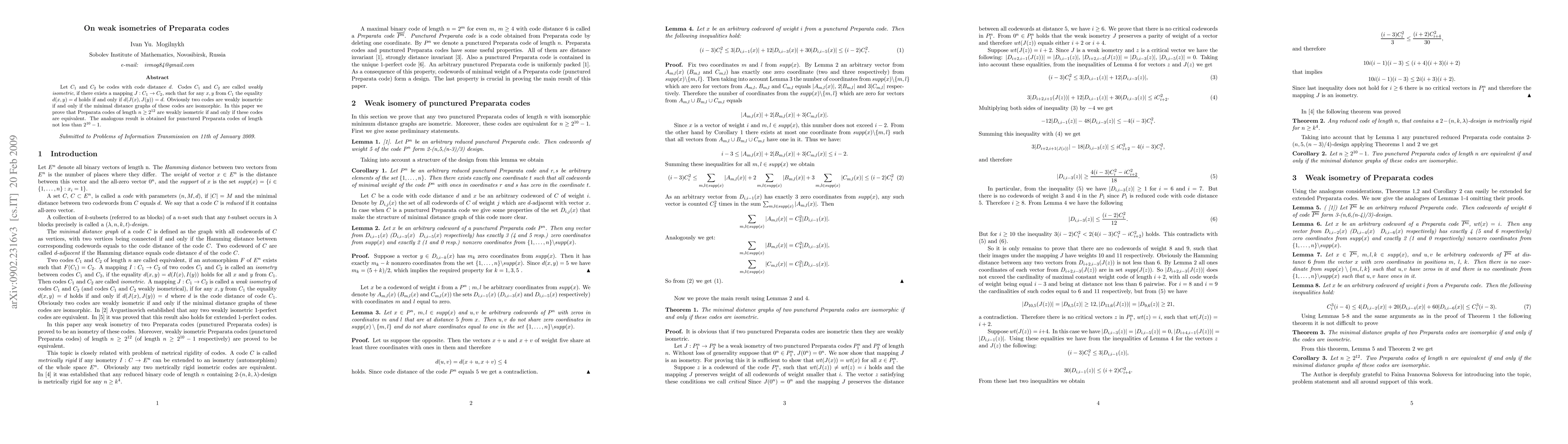 This paper proves that Preparata codes of length n ≥ 2^12 are weakly isometric if and only if they are equivalent, and similarly for punctured Preparata codes of length ≥ 2^10-1. The study establishes a connection between weak isometry and code equivalence based on the minimal distance graphs' isomorphism.