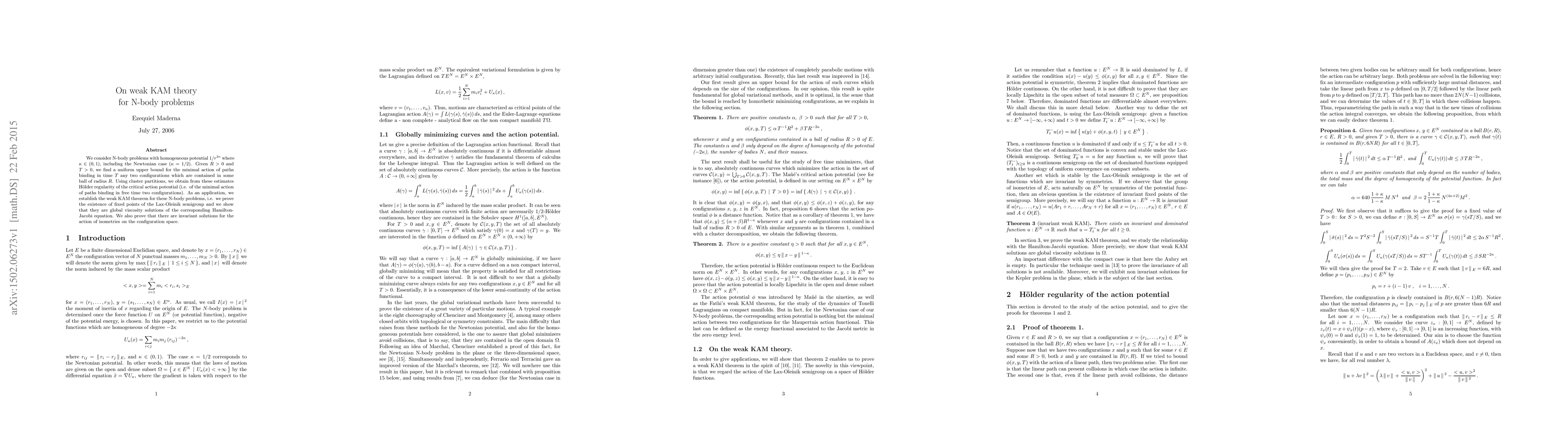 This paper explores weak KAM theory for N-body problems with a specific potential, deriving a uniform upper bound for minimal action paths and establishing Hölder regularity of the critical action potential. It proves the existence of fixed points for the Lax-Oleinik semigroup and global viscosity solutions for the Hamilton-Jacobi equation.