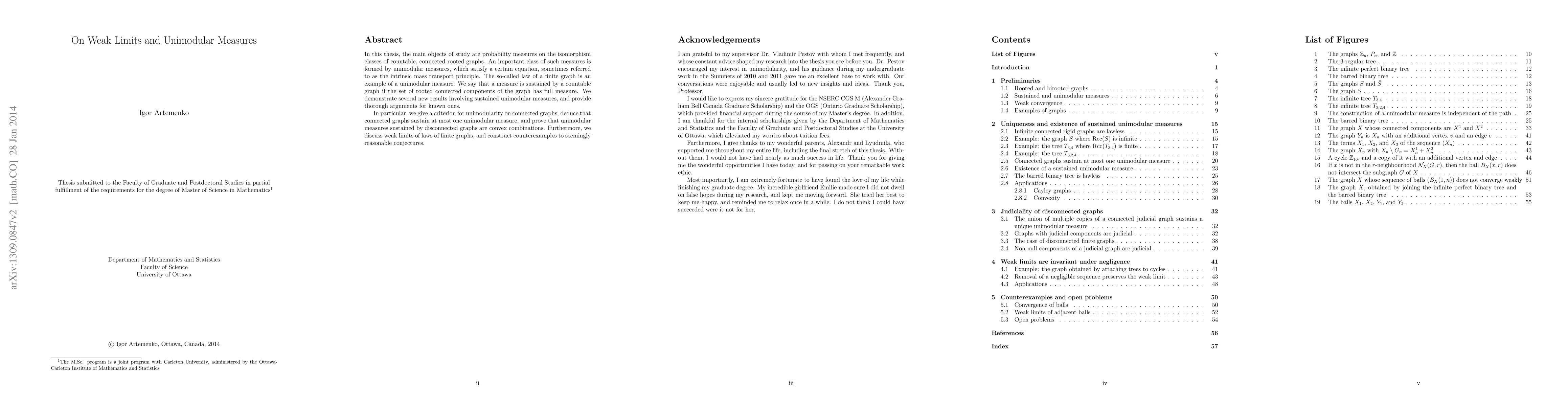 In this thesis, the main objects of study are probability measures on the isomorphism classes of countable, connected rooted graphs. An important class of such measures is formed by unimodular measures, which satisfy a certain equation, sometimes referred to as the intrinsic mass transport principle. The so-called law of a finite graph is an example of a unimodular measure. We say that a measure is sustained by a countable graph if the set of rooted connected components of the graph has full measure. We demonstrate several new results involving sustained unimodular measures, and provide thorough arguments for known ones. In particular, we give a criterion for unimodularity on connected graphs, deduce that connected graphs sustain at most one unimodular measure, and prove that unimodular measures sustained by disconnected graphs are convex combinations. Furthermore, we discuss weak limits of laws of finite graphs, and construct counterexamples to seemingly reasonable conjectures.