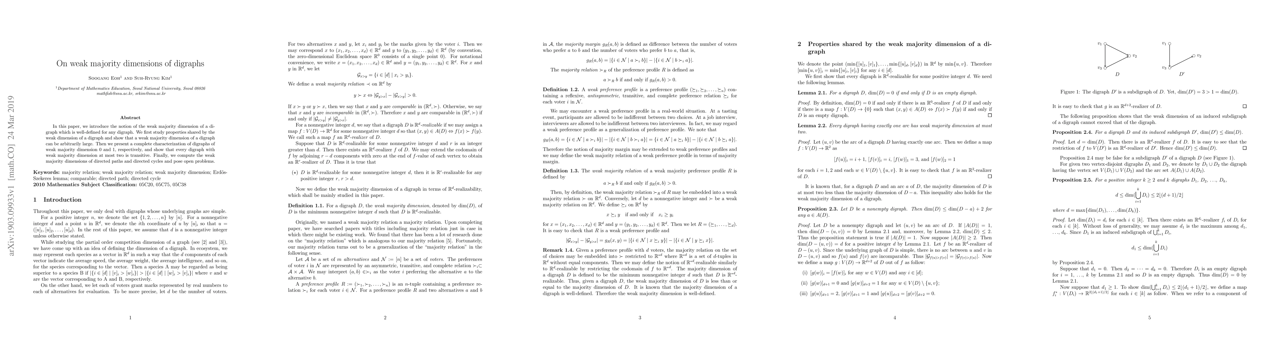 This paper introduces the concept of weak majority dimension for digraphs, demonstrating its properties and showing it can be arbitrarily large. It characterizes digraphs with weak majority dimensions of 0 and 1, and proves that those with dimension at most two are transitive, while also computing dimensions for directed paths and cycles.