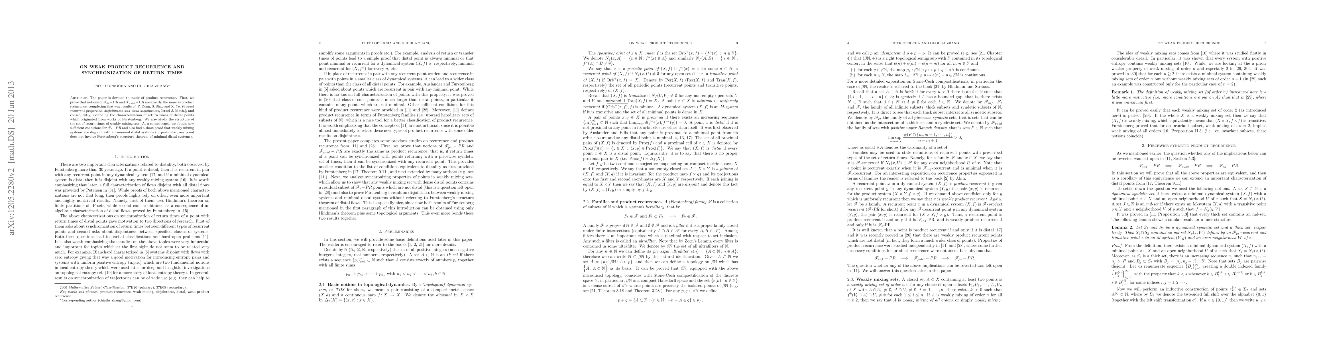 The paper is devoted to study of product recurrence. First, we prove that notions of $\F_{ps}-PR$ and $\F_{pubd}-PR$ are exactly the same as product recurrence, completing that way results of [P. Dong, S. Shao and X. Ye, \emph{Product recurrent properties, disjointness and weak disjointness}, Israel J. Math.], and consequently, extending the characterization of return times of distal points which originated from works of Furstenberg. We also study the structure of the set of return times of weakly mixing sets. As a consequence, we obtain new sufficient conditions for $\F_{s}-PR$ and also find a short proof that weakly mixing systems are disjoint with all minimal distal systems (in particular, our proof does not involve Furstenberg's structure theorem of minimal distal systems).