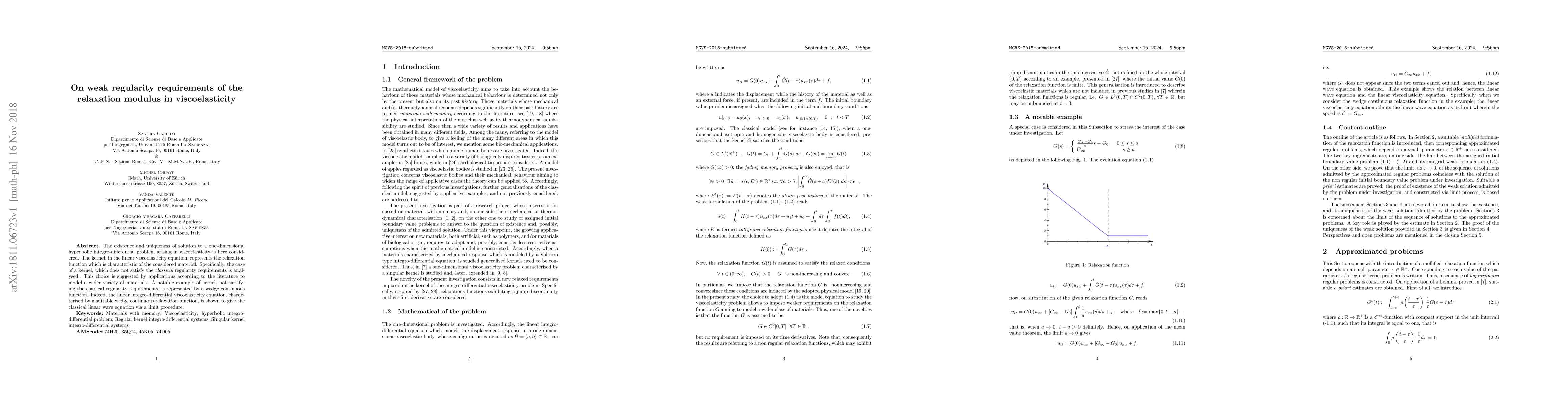 The existence and uniqueness of solution to a one-dimensional hyperbolic integro-differential problem arising in viscoelasticity is here considered. The kernel, in the linear viscoelasticity equation, represents the relaxation function which is characteristic of the considered material. Specifically, the case of a kernel, which does not satisfy the classical regularity requirements is analysed. This choice is suggested by applications according to the literature to model a wider variety of materials. A notable example of kernel, not satisfying the classical regularity requirements, is represented by a wedge continuous function. Indeed, the linear integro-differential viscoelasticity equation, characterised by a suitable wedge continuous relaxation function, is shown to give the classical linear wave equation via a limit procedure.