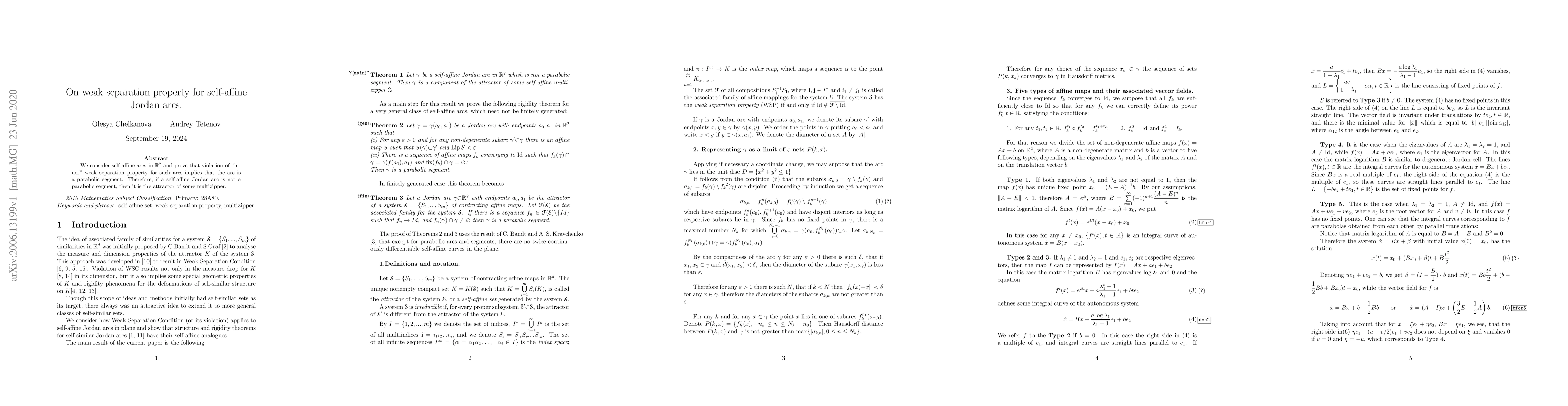 A self-affine Jordan arc in $eta R^2$ is either a parabolic segment or an attractor of some multizipper if it does not violate the inner weak separation property.