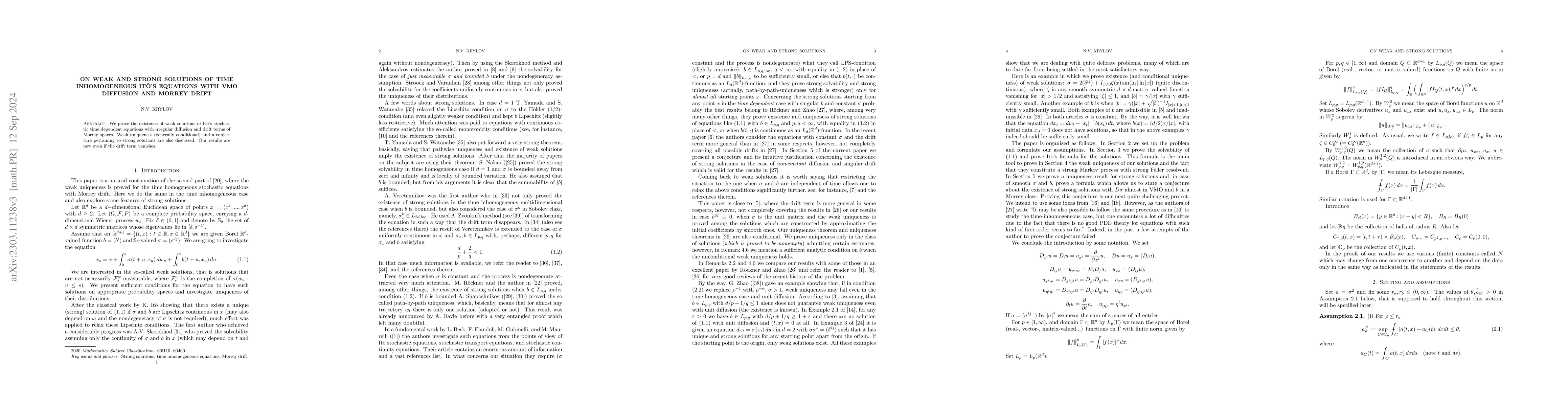 This paper establishes the existence of weak solutions for time-inhomogeneous Itô's stochastic differential equations featuring diffusion terms of VMO regularity and Morrey drift terms. Additionally, it discusses weak uniqueness and provides insights into strong solution properties.