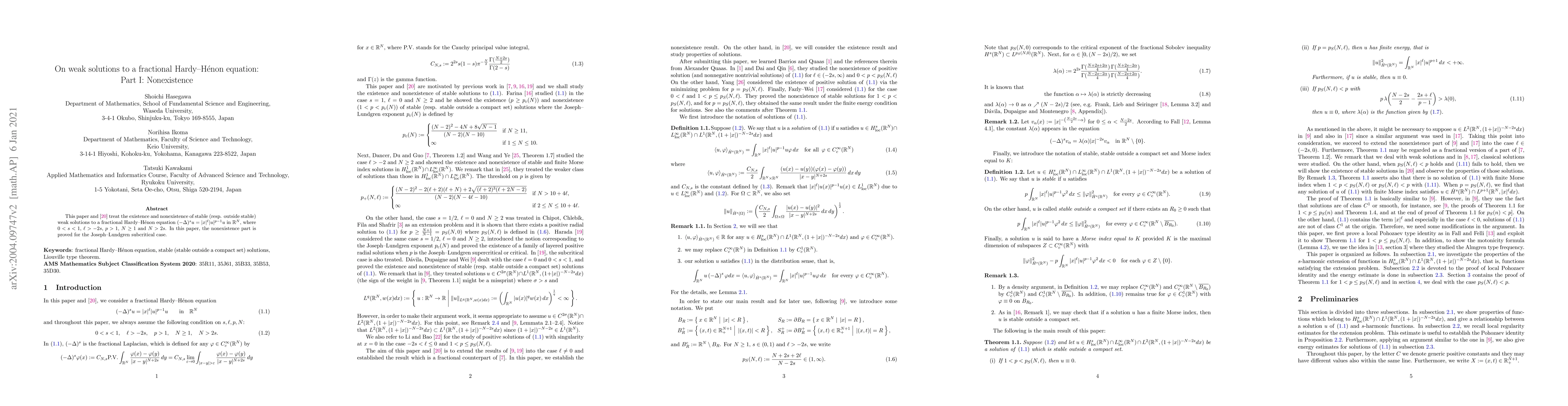 This paper and [17] treat the existence and nonexistence of stable (resp. outside stable) weak solutions to a fractional Hardy--H\'enon equation $(-\Delta)^s u = |x|^\ell |u|^{p-1} u$ in $\mathbb{R}^N$ where $0 < s < 1$, $\ell > -2s$, $p>1$, $N \geq 1$ and $N > 2s$. In this paper, the nonexistence part is proved for the Joseph--Lundgren subcritical case.