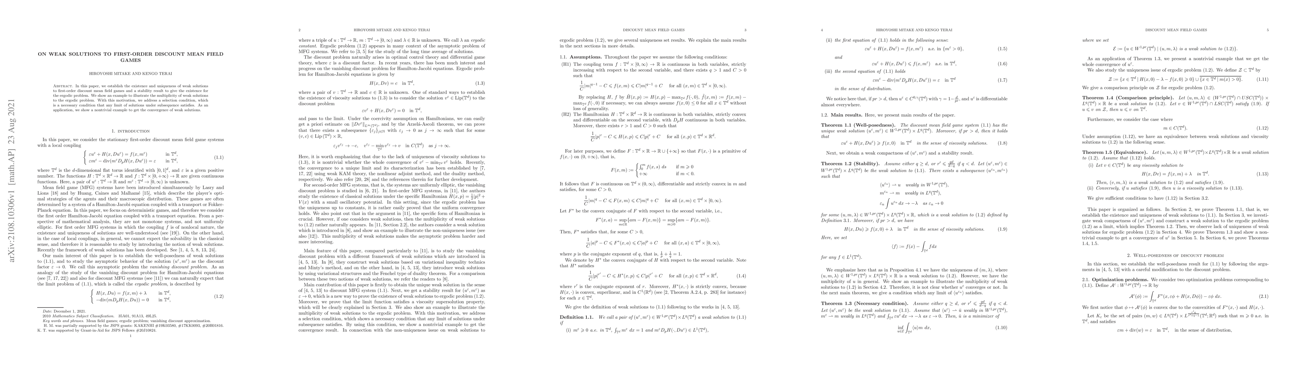 In this paper, we establish the existence and uniqueness of weak solutions to first-order discount mean field games and a stability result to give the existence for the ergodic problem. We show an example to illustrate the multiplicity of weak solutions to the ergodic problem. With this motivation, we address a selection condition, which is a necessary condition that any limit of solutions under subsequence satisfies. As an application, we show a nontrivial example to get the convergence of weak solutions.
