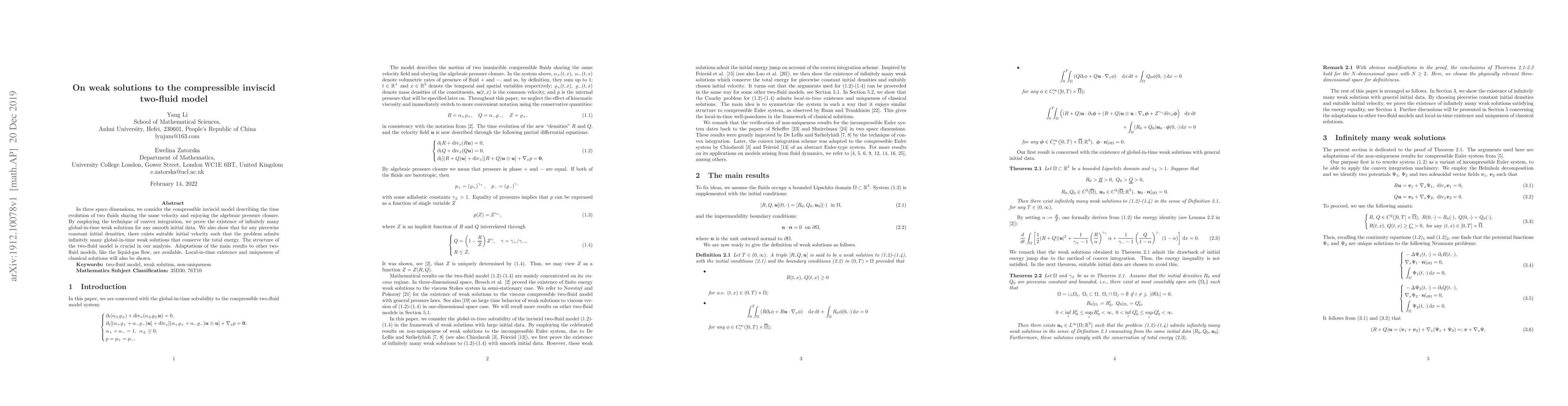 This paper proves the existence of infinitely many global-in-time weak solutions to the compressible inviscid two-fluid model using convex integration, and demonstrates that for piecewise constant initial densities, suitable initial velocities can yield solutions conserving total energy. The study also covers local-in-time existence and uniqueness of classical solutions.
