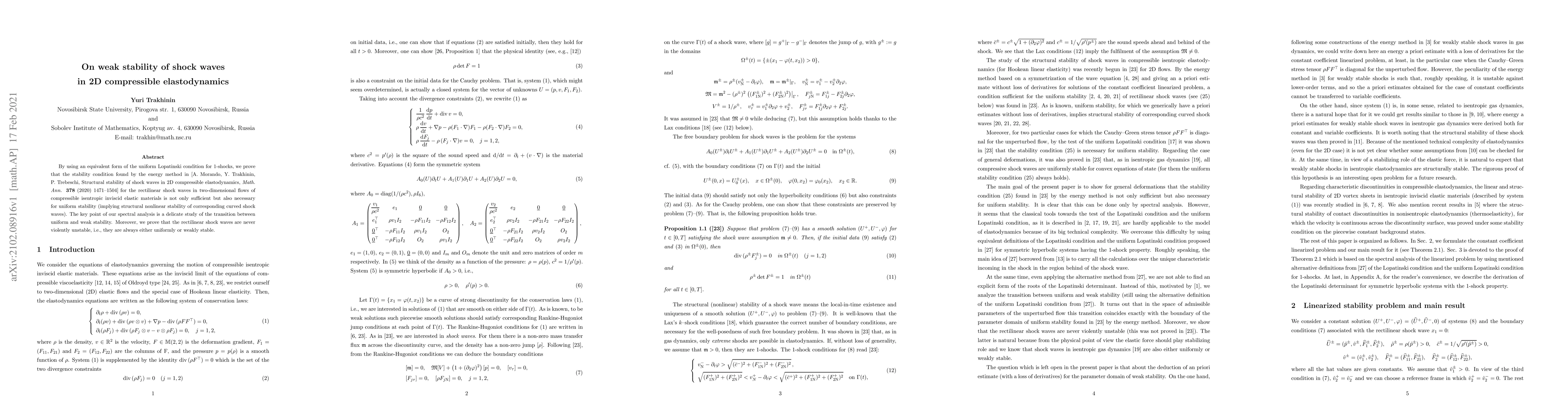 This paper proves that the stability condition derived via the energy method for rectilinear shock waves in 2D compressible elastodynamics is both necessary and sufficient for uniform stability. It also demonstrates that these shock waves are never violently unstable, always maintaining either uniform or weak stability.