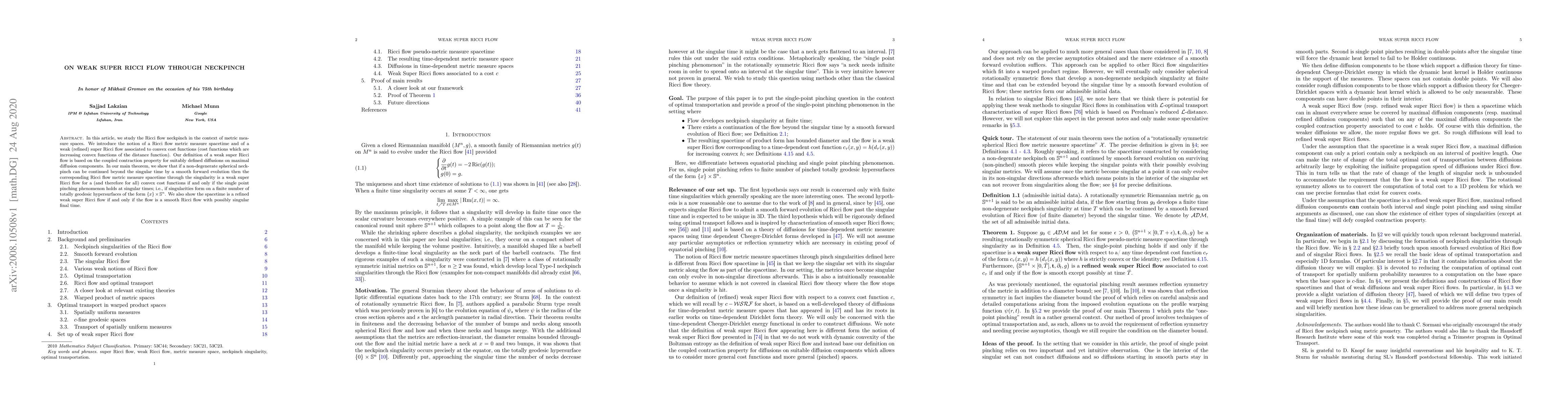 In this article, we study the Ricci flow neckpinch in the context of metric measure spaces. We introduce the notion of a Ricci flow metric measure spacetime and of a weak (refined) super Ricci flow associated to convex cost functions (cost functions which are increasing convex functions of the distance function). Our definition of a weak super Ricci flow is based on the coupled contraction property for suitably defined diffusions on maximal diffusion components. In our main theorem, we show that if a non-degenerate spherical neckpinch can be continued beyond the singular time by a smooth forward evolution then the corresponding Ricci flow metric measure spacetime through the singularity is a weak super Ricci flow for a (and therefore for all) convex cost functions if and only if the single point pinching phenomenon holds at singular times; i.e., if singularities form on a finite number of totally geodesic hypersurfaces of the form $\{x\} \times \sphere^n$. We also show the spacetime is a refined weak super Ricci flow if and only if the flow is a smooth Ricci flow with possibly singular final time.