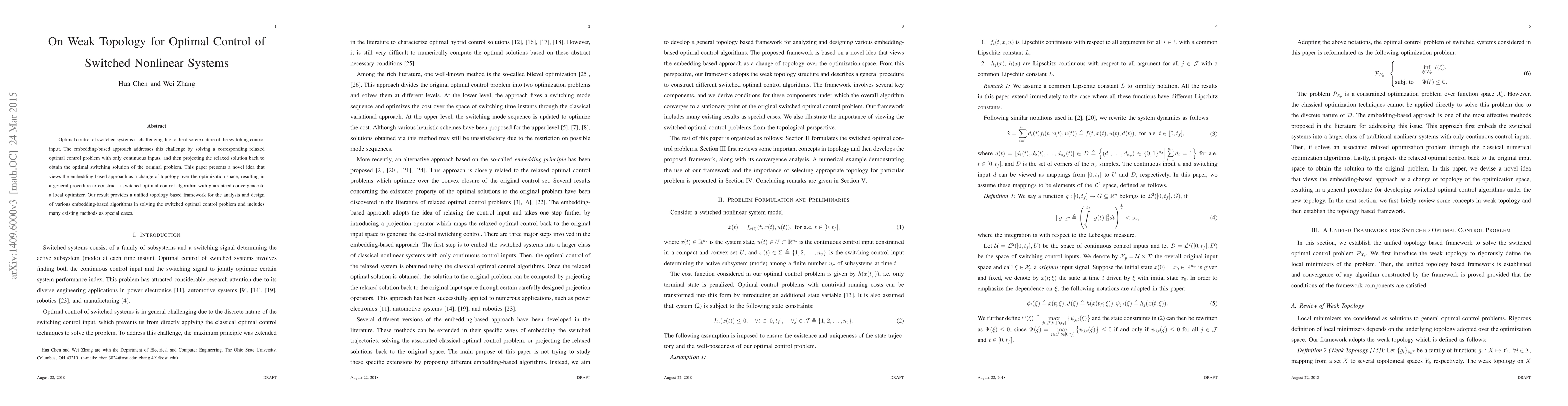 This paper introduces a novel weak topology framework for optimal control of switched nonlinear systems, transforming the discrete switching problem into a continuous optimization problem, and ensuring convergence to a local optimizer through a general procedure. The proposed topology-based approach unifies various embedding-based algorithms and includes existing methods as special cases.