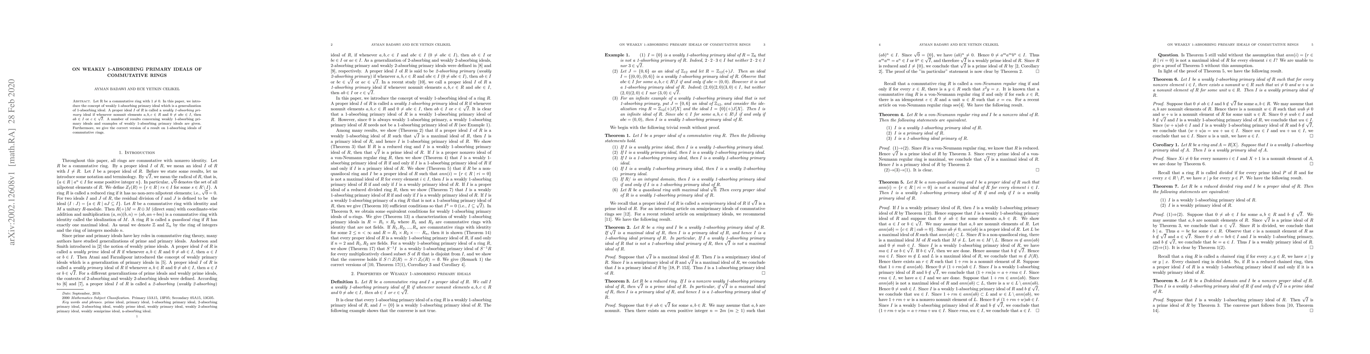 This paper introduces weakly 1-absorbing primary ideals in commutative rings, generalizing the concept of 1-absorbing ideals, and presents various results and examples illustrating these new ideals. It also corrects a previous result on 1-absorbing ideals.