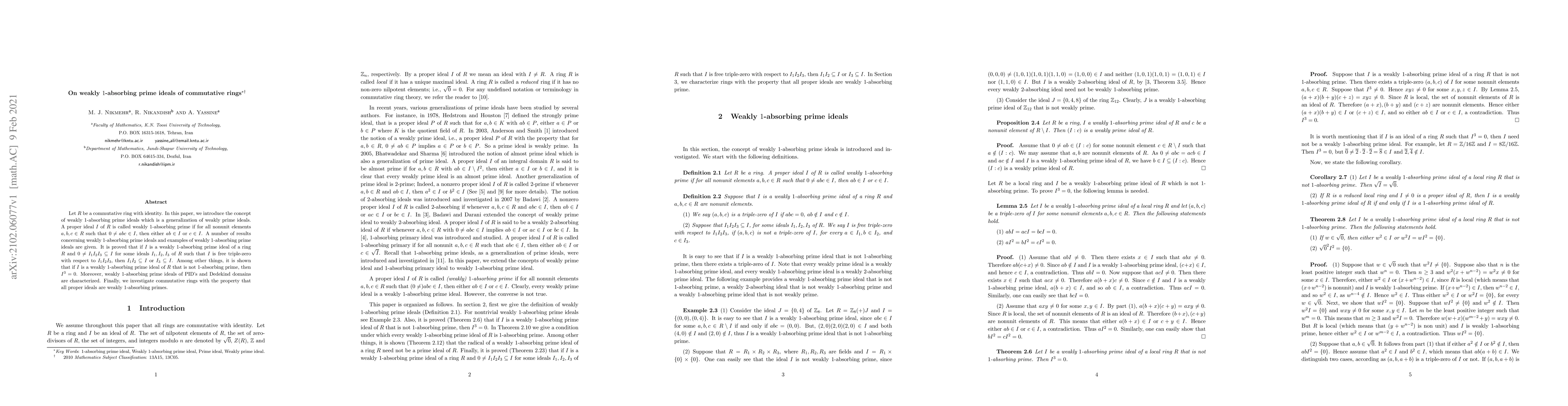 This paper introduces the concept of weakly $1$-absorbing prime ideals in commutative rings, generalizing weakly prime ideals, and provides several results and examples. It proves that if $I$ is a weakly $1$-absorbing prime ideal, then certain triple-zero conditions imply $I_1I_2 \subseteq I$ or $I_3 \subseteq I$, and characterizes these ideals in PIDs and Dedekind domains.