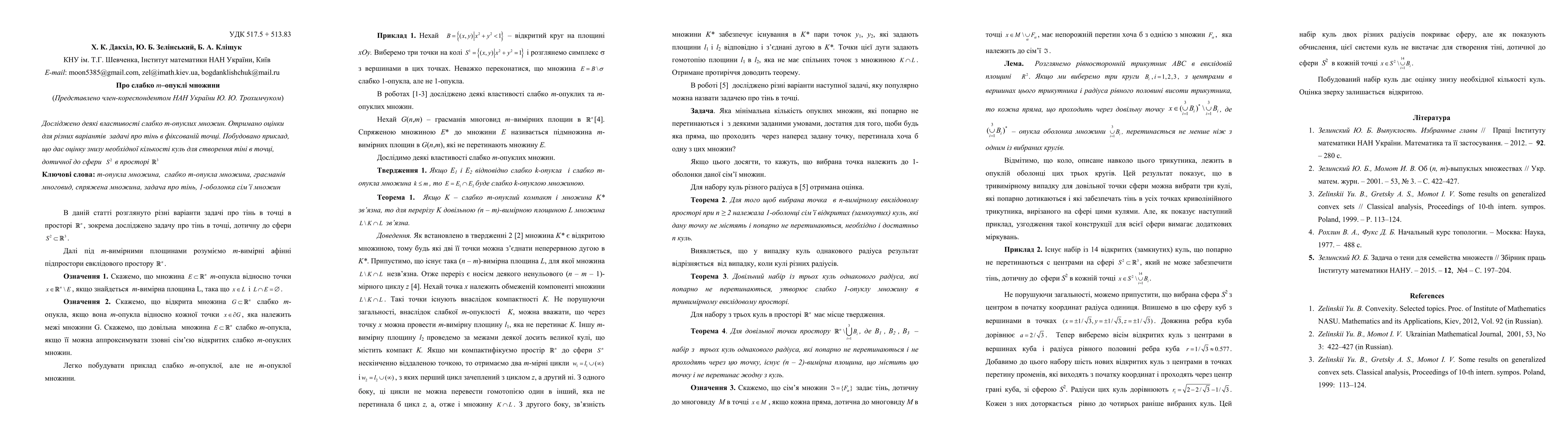 There were obtained some properties of weakly m-convex sets. Various kinds of the problem of shadow were investigated. There was obtained the lower estimation for the number of balls that are necessary to create a shadow at the point of the sphere in three-dimensional Euclidean space