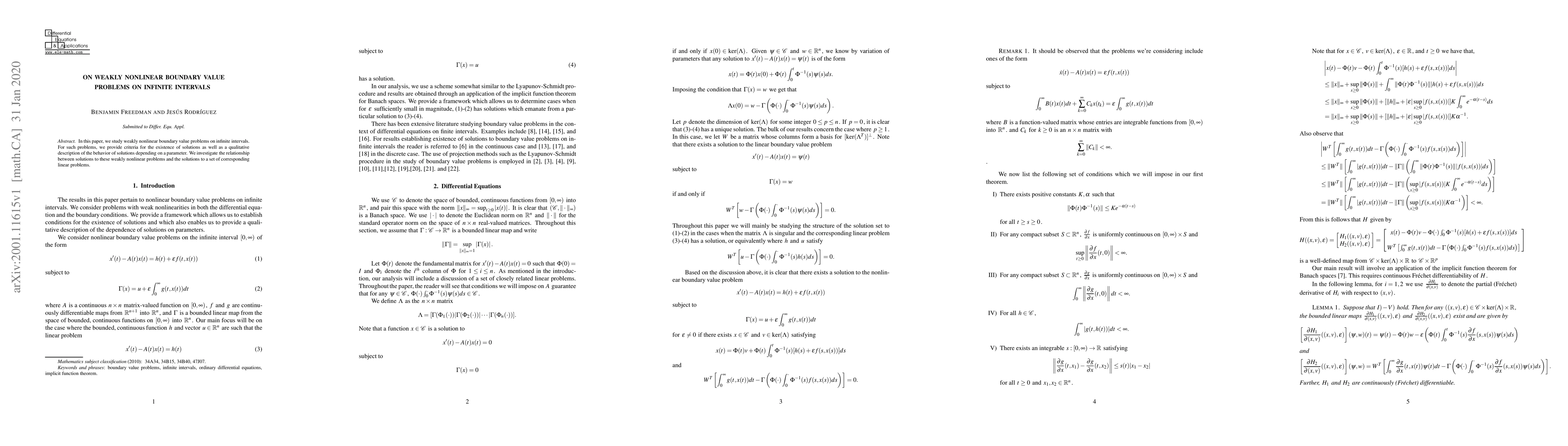 In this paper, we study weakly nonlinear boundary value problems on infinite intervals. For such problems, we provide criteria for the existence of solutions as well as a qualitative description of the behavior of solutions depending on a parameter. We investigate the relationship between solutions to these weakly nonlinear problems and the solutions to a set of corresponding linear problems.
