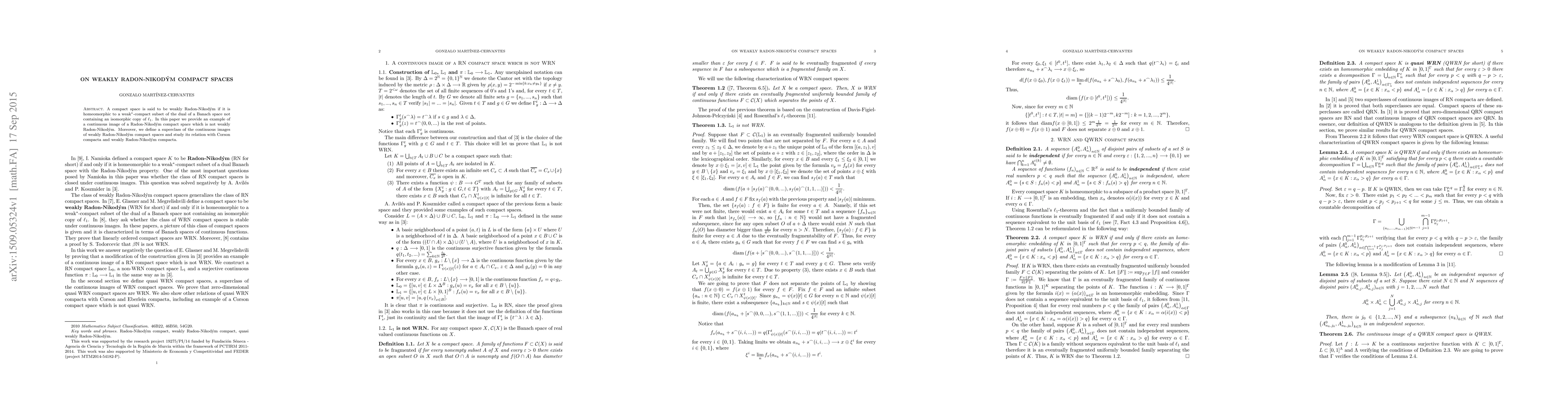 A compact space is said to be weakly Radon-Nikod\'ym if it is homeomorphic to a weak*-compact subset of the dual of a Banach space not containing an isomorphic copy of $\ell_1$. In this work we provide an example of a continuous image of a Radon-Nikod\'ym compact space which is not weakly Radon-Nikod\'ym. Moreover, we define a superclass of the continuous images of weakly Radon-Nikod\'ym compact spaces and study its relation with Corson compacta and weakly Radon-Nikod\'ym compacta.