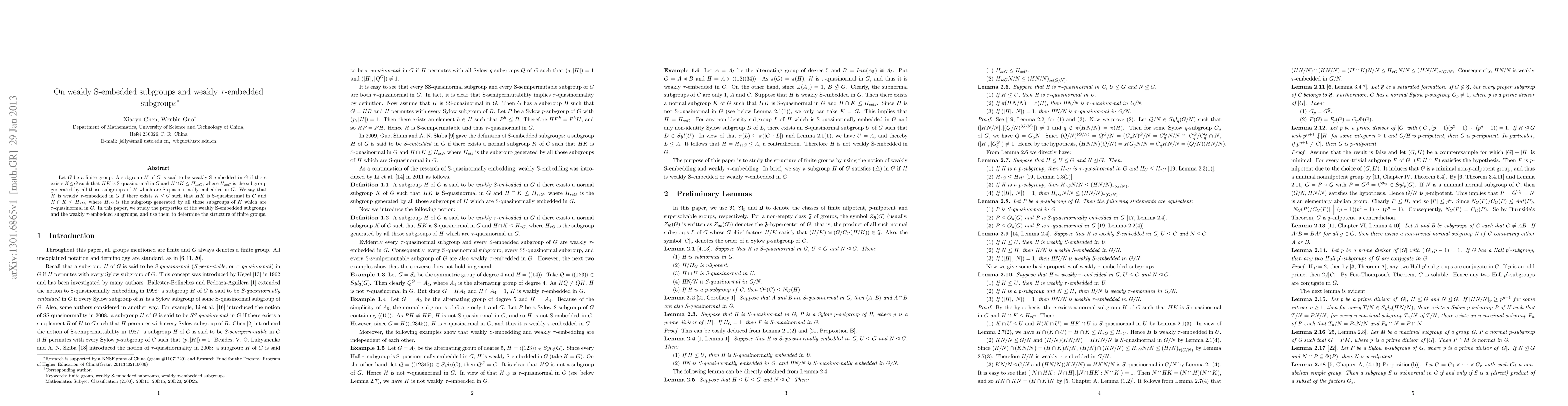 This paper investigates weakly S-embedded and weakly τ-embedded subgroups in finite groups, defining their conditions and exploring their structural implications for group theory. The study aims to determine group structures through these subgroup classifications.