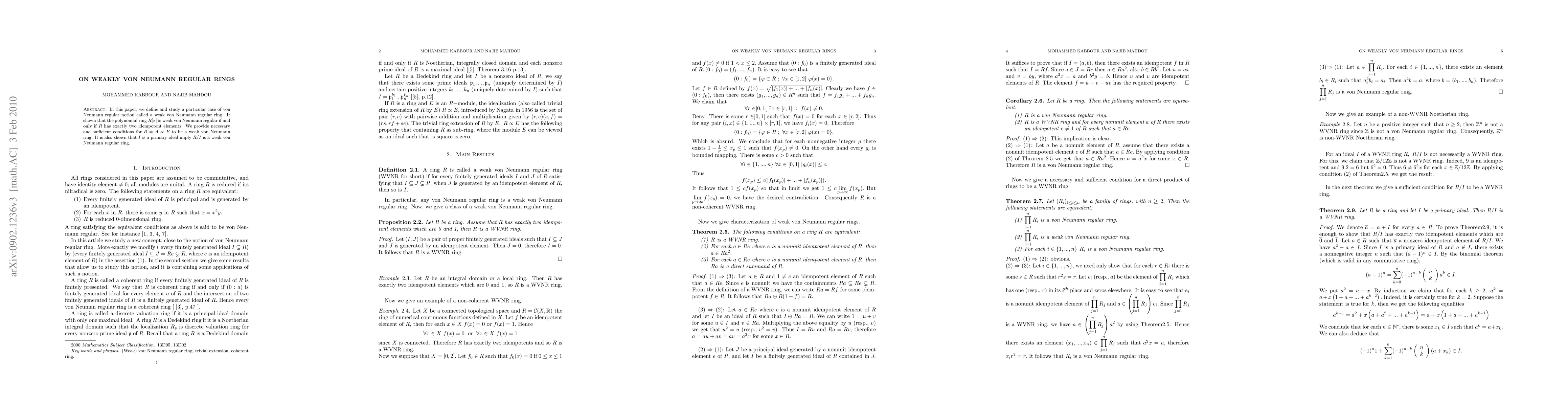 In this paper, we define and study a particular case of von Neumann regular notion called a weak von Neumann regular ring. It shown that the polynomial ring $R[x]$ is weak von Neumann regular if and only if $R$ has exactly two idempotent elements. We provide necessary and sufficient conditions for $ R=A\propto E $ to be a weak von Neumann ring. It is also shown that $I$ is a primary ideal imply $R/I$ is a weak von Neumann regular ring.